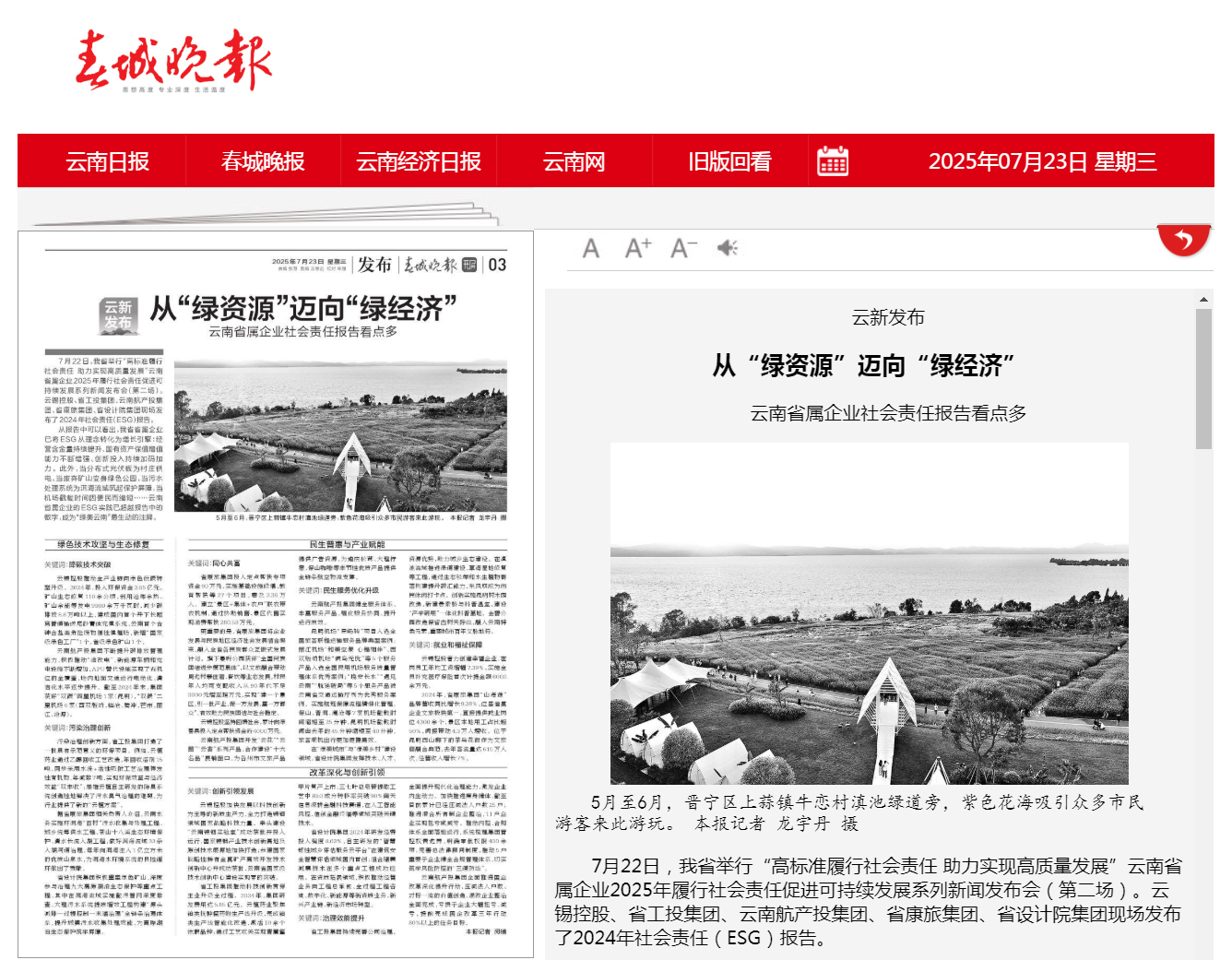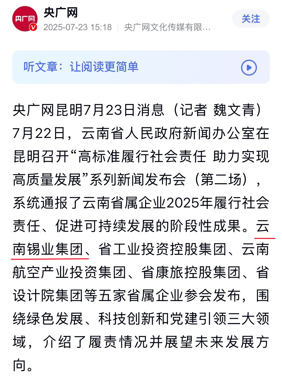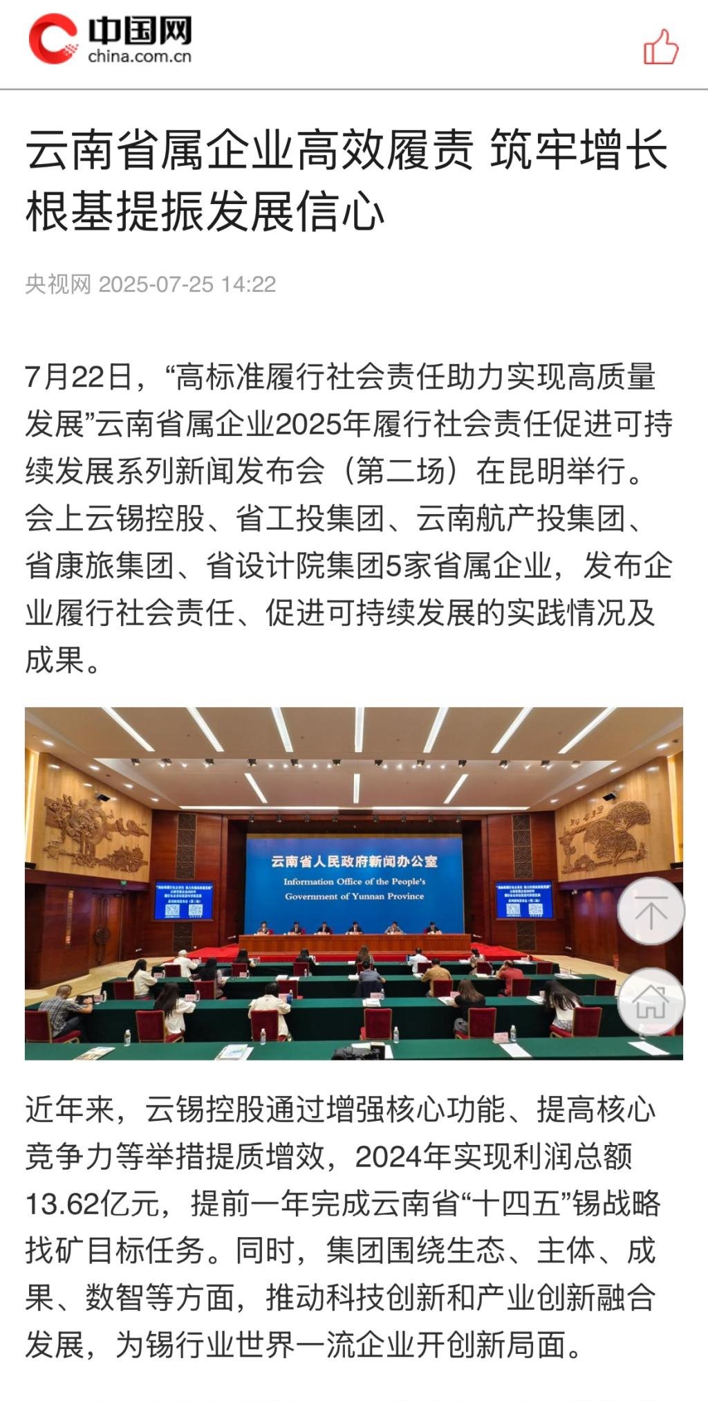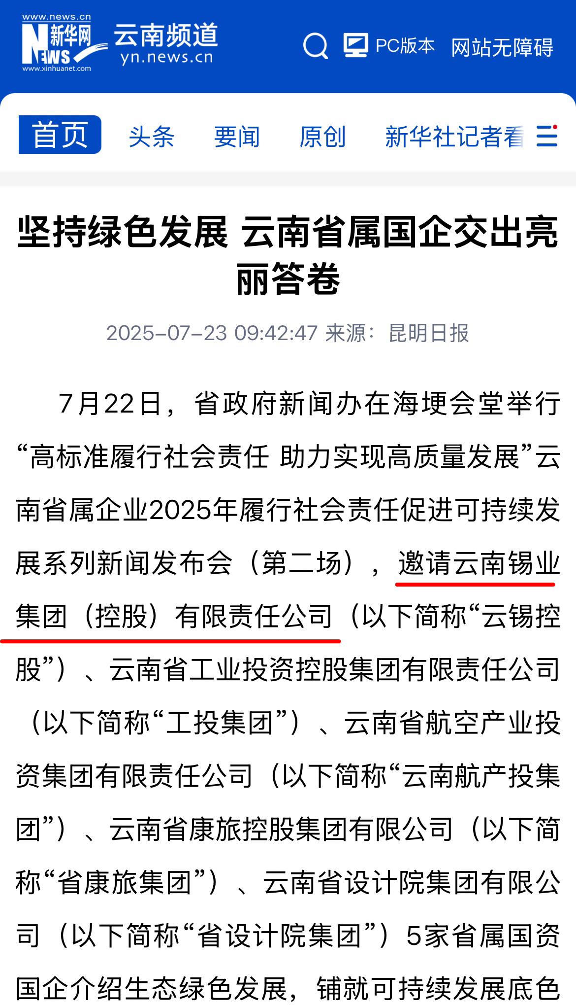 链接:(央广网)、(央视影音)、(新华网)、(新华时讯)、(中国日报网)、(中国新闻网)、(中国网)(云南新闻联播)、(云南卫视晚间新闻)、(云南发布)、(云南日报)、(云南日报-云新闻)、(云南网)、(七彩云端)、(云南省人民政府)、(云岭先锋网)、(云南国资)、(云南政协报)、(有色金属报)、(有色新闻)、(腾讯新闻)、(今日头条)、(搜狐)、(网易)、(新浪微博)、(新浪财经)、(都市时报)、(国泰君安)、(昆明日报)、(春城晚报)、(昆明信息港)、(开屏新闻)