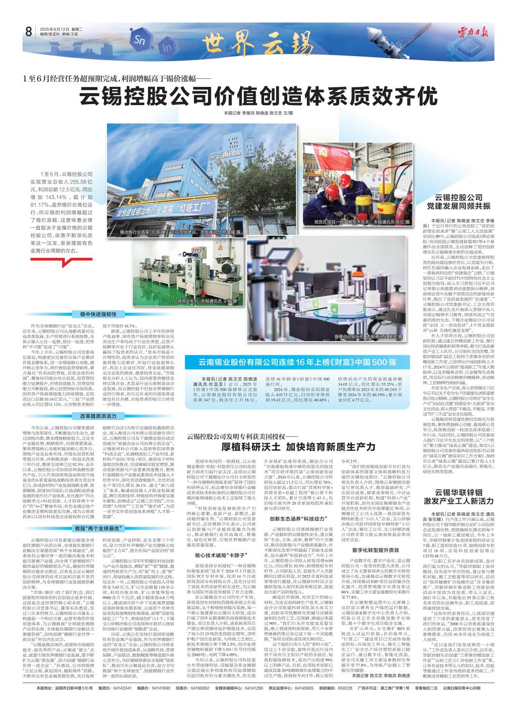 云锡控股公司围绕锡铟行业资源、产业链和供应链韧性安全,重点聚焦“生态、主体、成果、数智”四个关键词,推动创新链与产业链深度融合,在不断深化改革中构建起了创新生态体系,加大涵养“科技新动力”。今年上半年,云锡控股公司投入研发经费6.04亿元,同比增长10.5%;新增授权专利57件。公司研发人员、直接生产人员薪酬同比增长明显,对2025年度科技成果等进行激励,在云锡新材料试点实施研发投入视同利润考核还原,鼓励加大新产品研发投入。