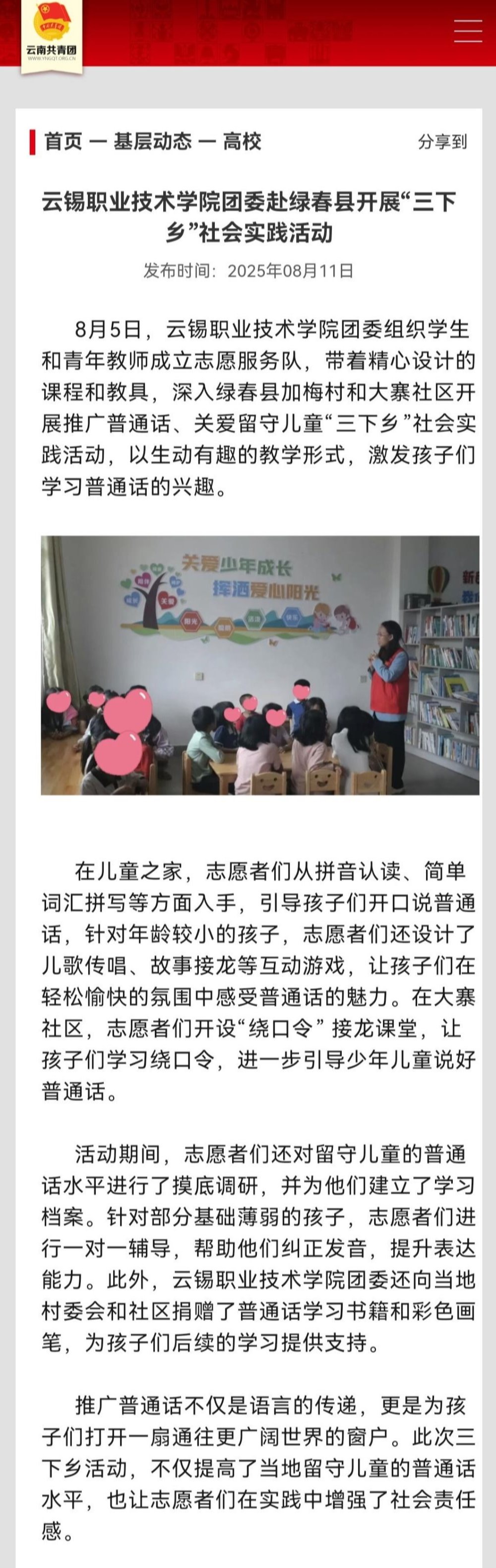 云南共青团:云锡职业技术学院团委赴绿春县开展“三下乡”社会实践活动