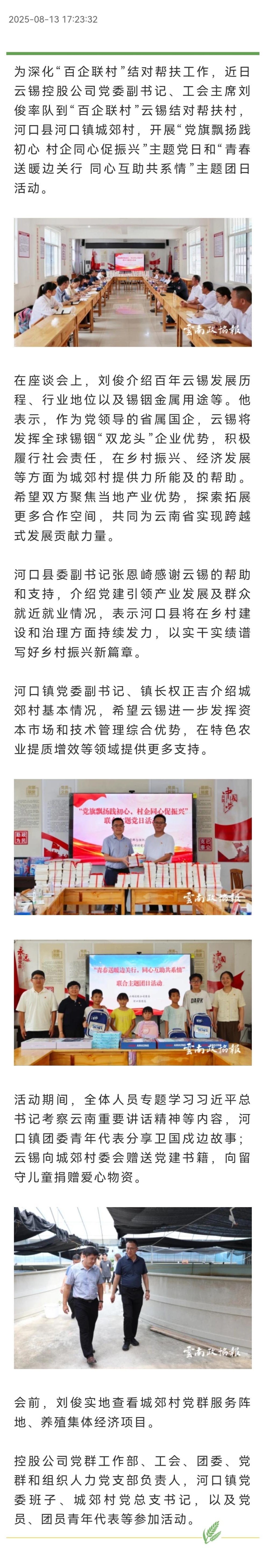 云南政协报:云锡赴河口县开展“百企联村”党团共建活动
