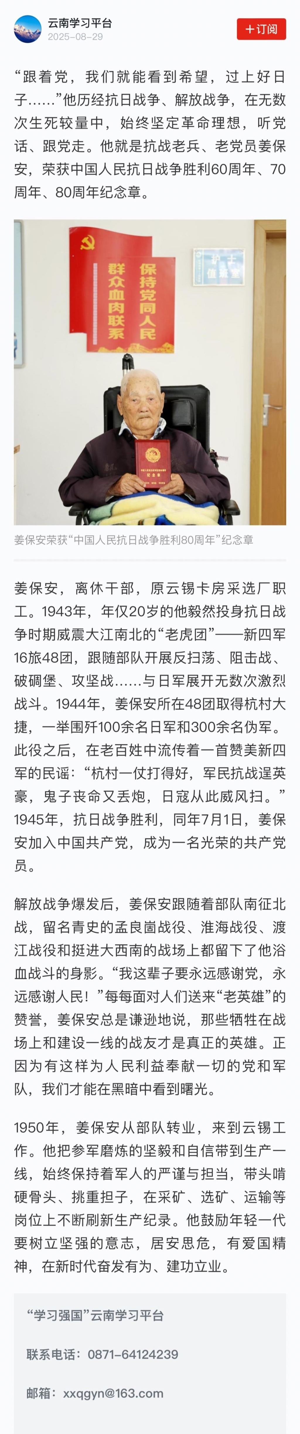 学习强国:姜保安——从新四军“老虎团”战士到云锡奋斗者
