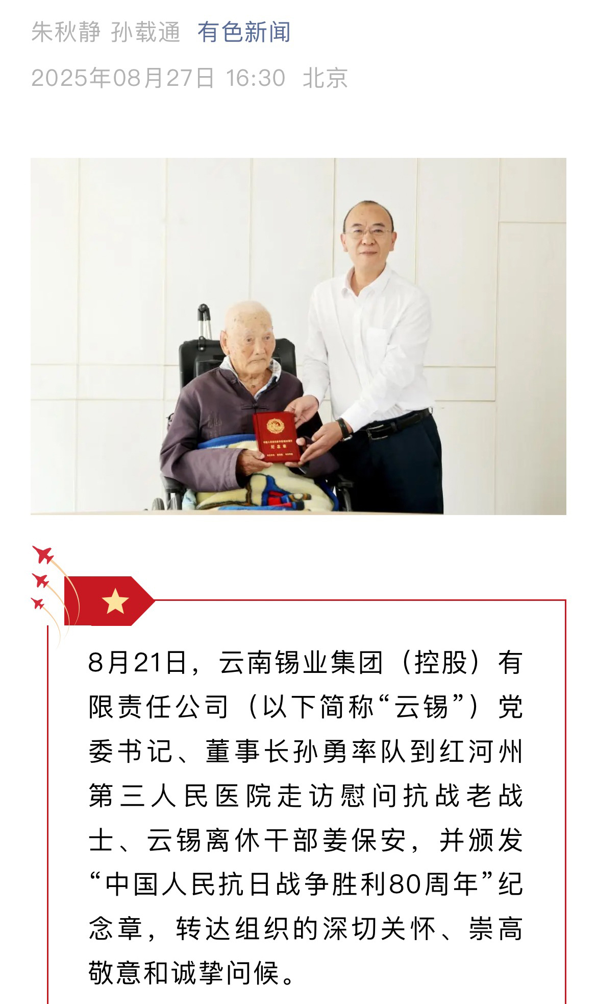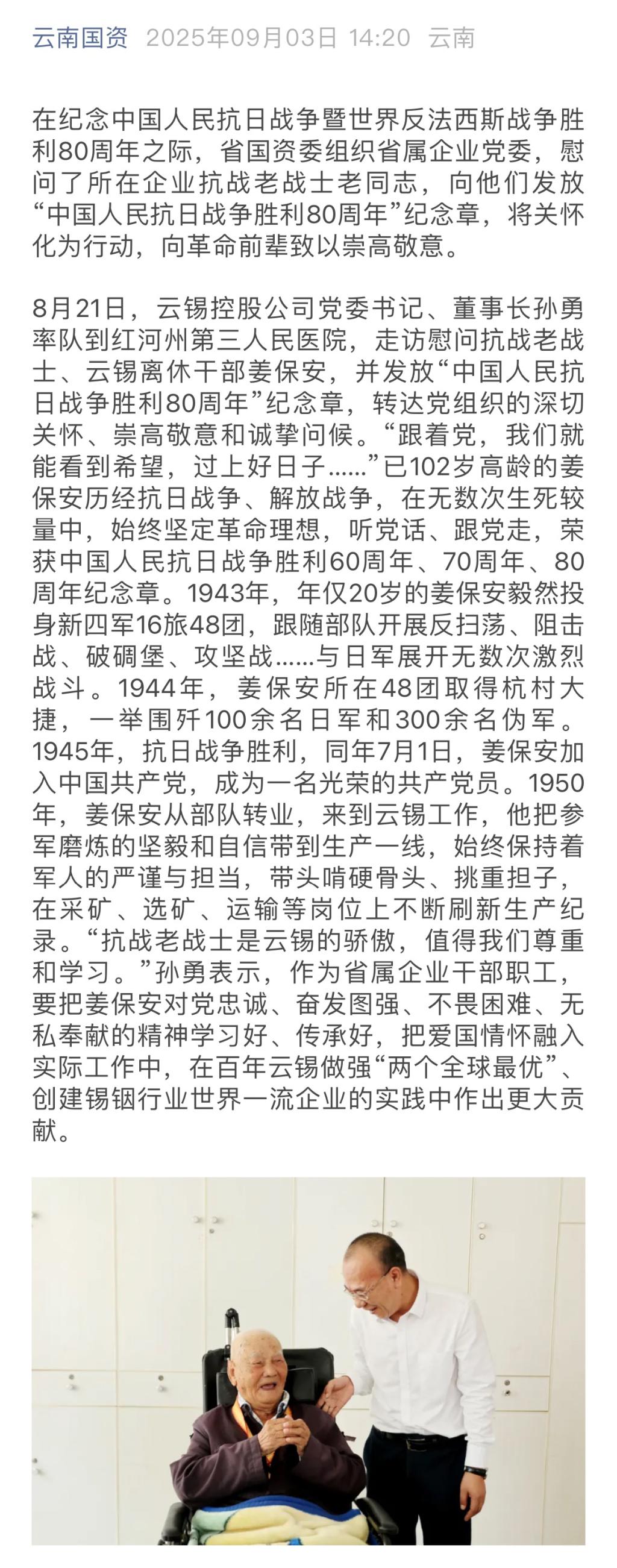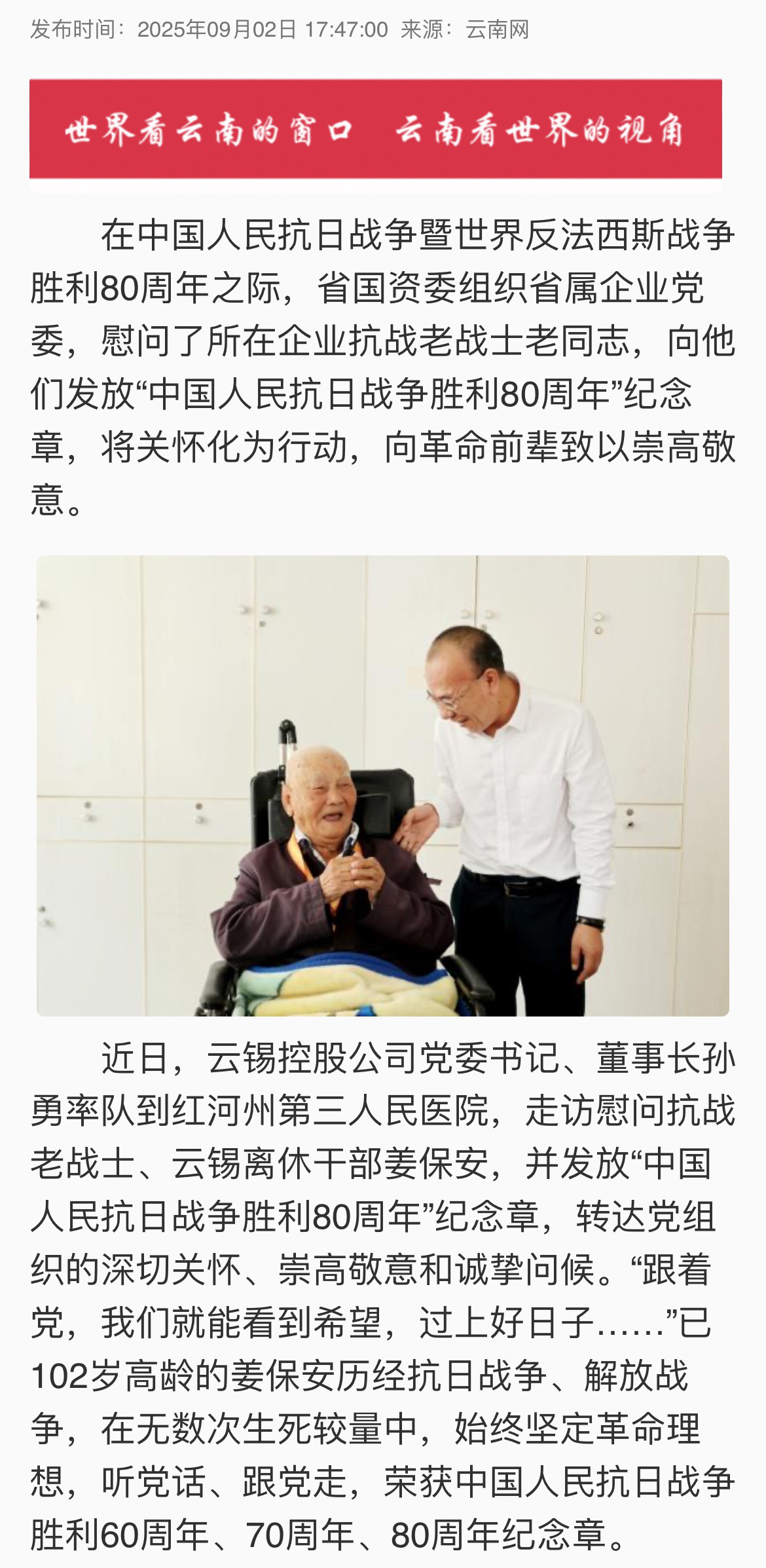 8月21日,云锡控股公司负责人到红河哈尼族彝族自治州第三人民医院,走访慰问抗战老战士、云锡离休干部姜保安,并发放“中国人民抗日战争胜利80周年”纪念章,转达党组织的深切关怀、崇高敬意和诚挚问候。已102岁高龄的姜保安历经抗日战争、解放战争,在无数次生死较量中,始终坚定革命理想,听党话、跟党走。1943年,20岁的姜保安毅然投身抗日战争时期威震大江南北的“老虎团”——新四军16旅48团,跟随部队与日军展开无数次激烈战斗。1944年,姜保安所在48团取得杭村大捷,一举围歼100余名日军和300余名伪军。1945年7月1日,姜保安光荣加入中国共产党。1950年,姜保安从部队转业,到云锡工作,他始终保持着军人的严谨与担当,带头啃硬骨头、挑重担子,在采矿、选矿、运输等岗位上不断刷新生产纪录。“抗战老战士是云锡的教案,值得我们尊重和学习。”云锡控股公司负责人表示,作为省属企业干部职工,要把姜保安对党忠诚、奋发图强、不畏困难、无私奉献的精神学习好、传承好,把爱国情怀融入实际工作中,在百年云锡做强“两个全球最优”、创建锡铟行业世界一流企业的实践中作出更大贡献。
