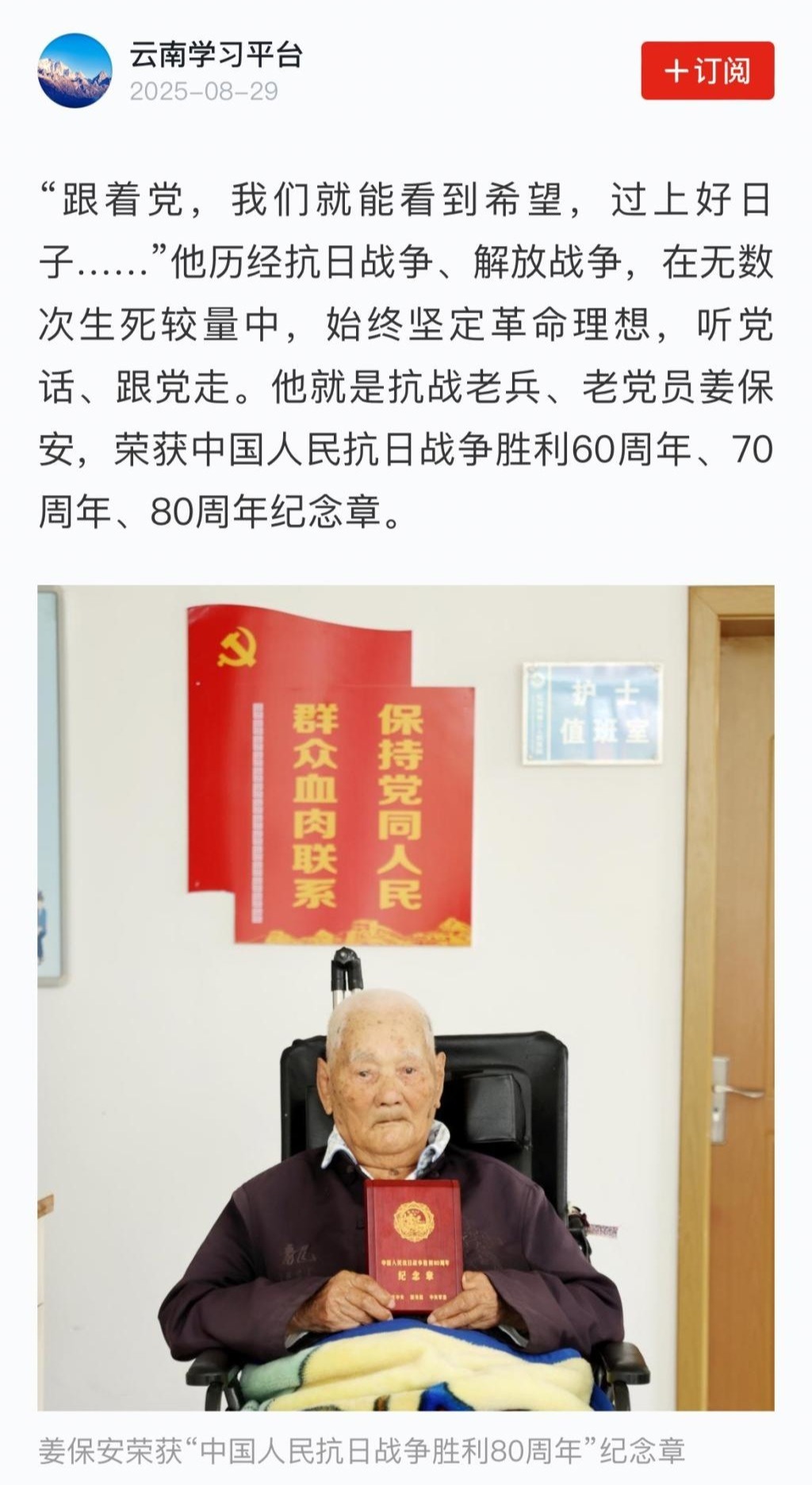 抗战老战士、云南煤炭产业集团退休职工闵尔骞捧着金灿灿的“中国人民抗日战争胜利80周年”纪念章激动地说:“这枚沉甸甸的纪念章对我意义非凡,它让我重温了那段峥嵘岁月,更让我深切感受到党和政府始终如一的关怀,以及对我们那一代人毕生奉献的关心与肯定。”