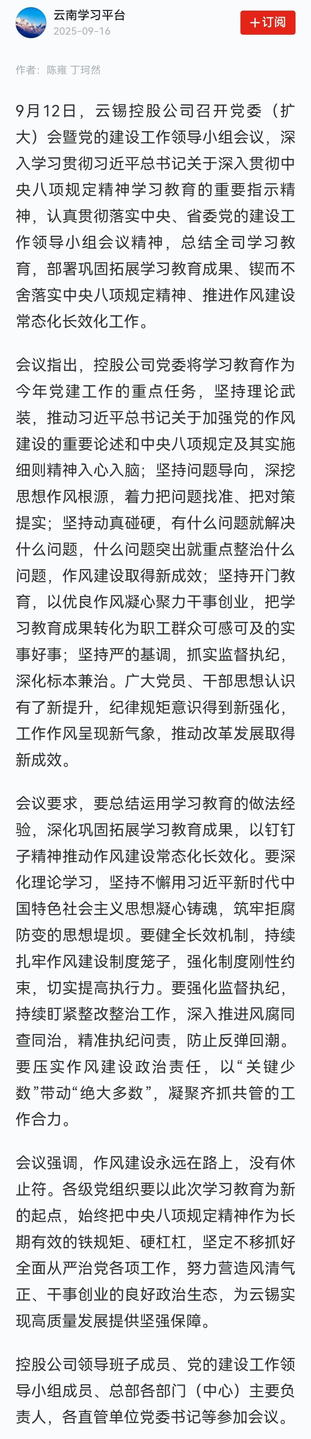 学习强国:云锡控股公司党委总结学习教育 推进作风建设常态化长效化