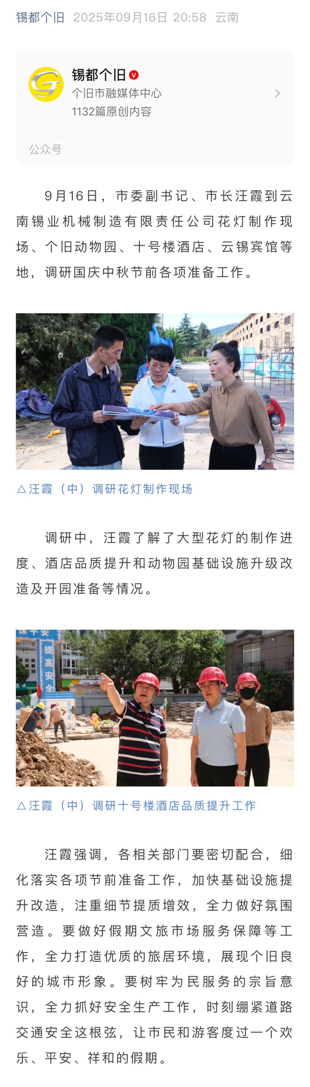 锡都个旧:汪霞调研国庆中秋节前准备工作时强调 强化服务保障 全力确保群众欢乐平安祥和过节