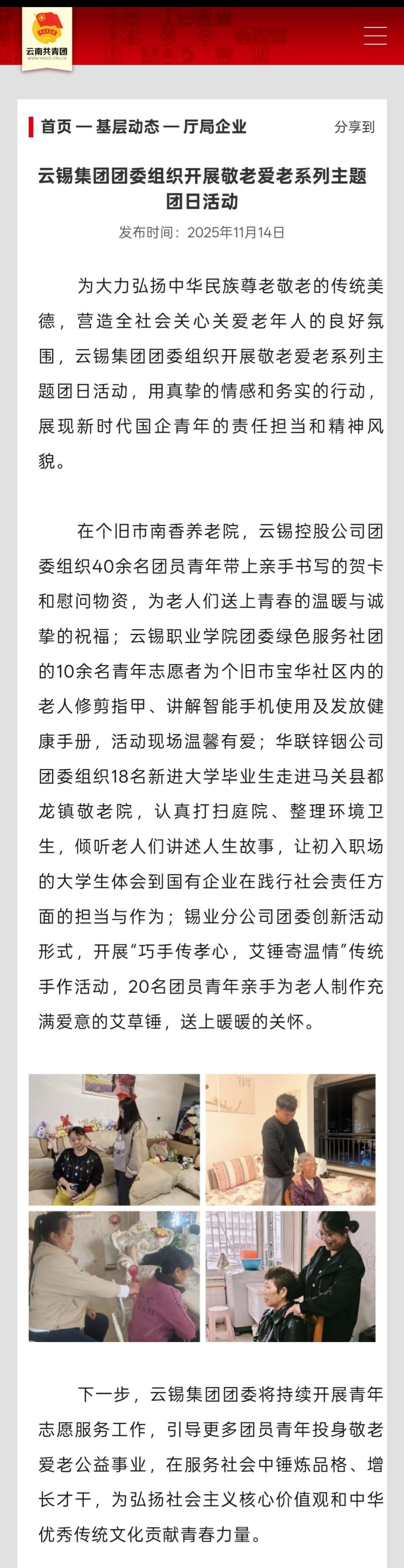云南共青团:云锡集团团委组织开展敬老爱老系列主题团日活动