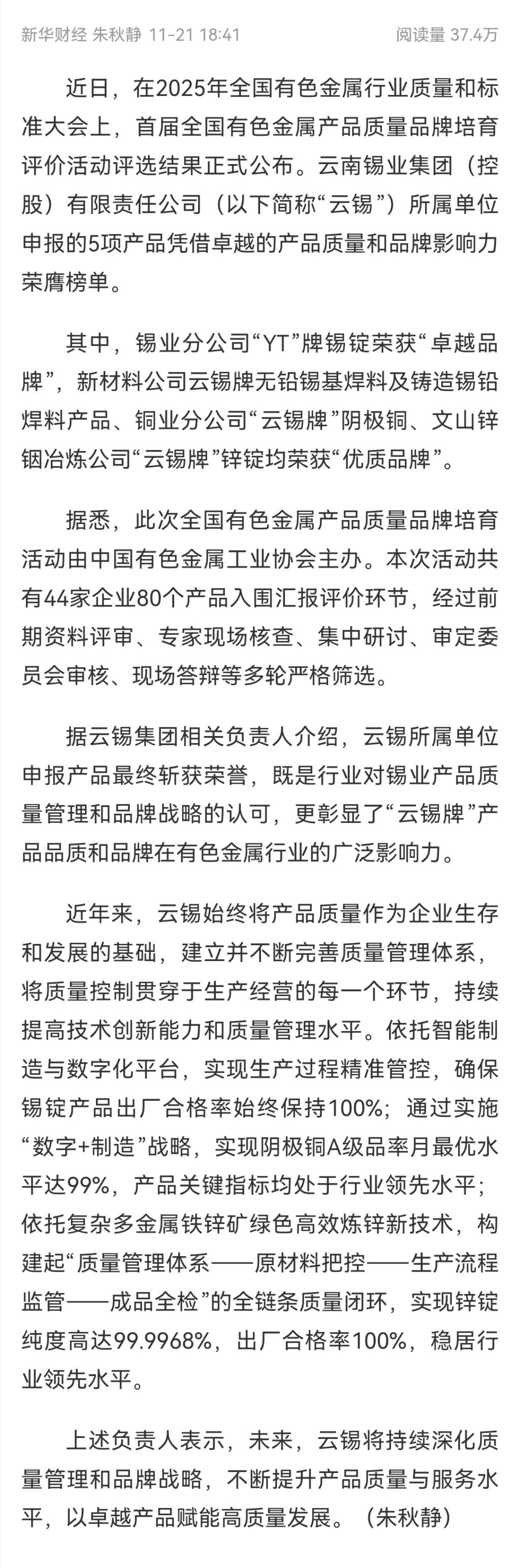 新华财经:云锡5项产品荣获全国有色金属行业“质量品牌奖”
