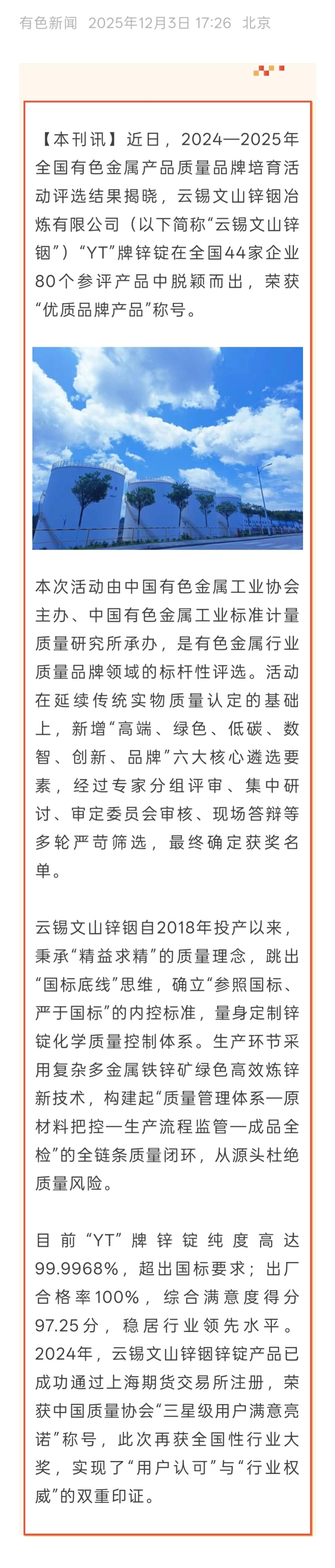 有色新闻:云锡文山锌铟锌锭荣获全国有色金属“优质品牌产品”称号
