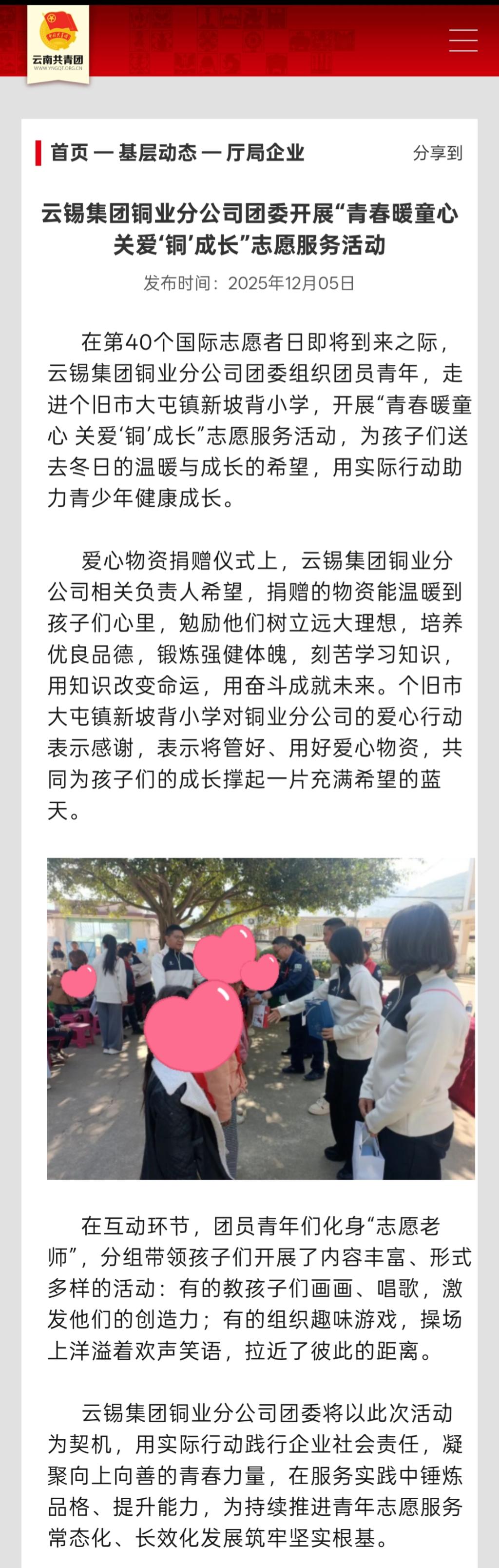 云南共青团:云锡集团铜业分公司团委开展“青春暖童心 关爱‘铜’成长”志愿服务活动