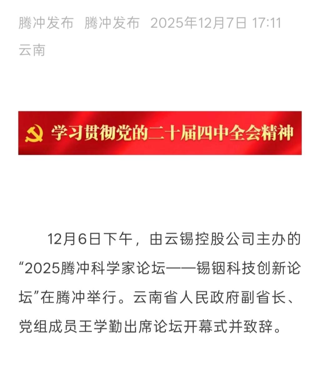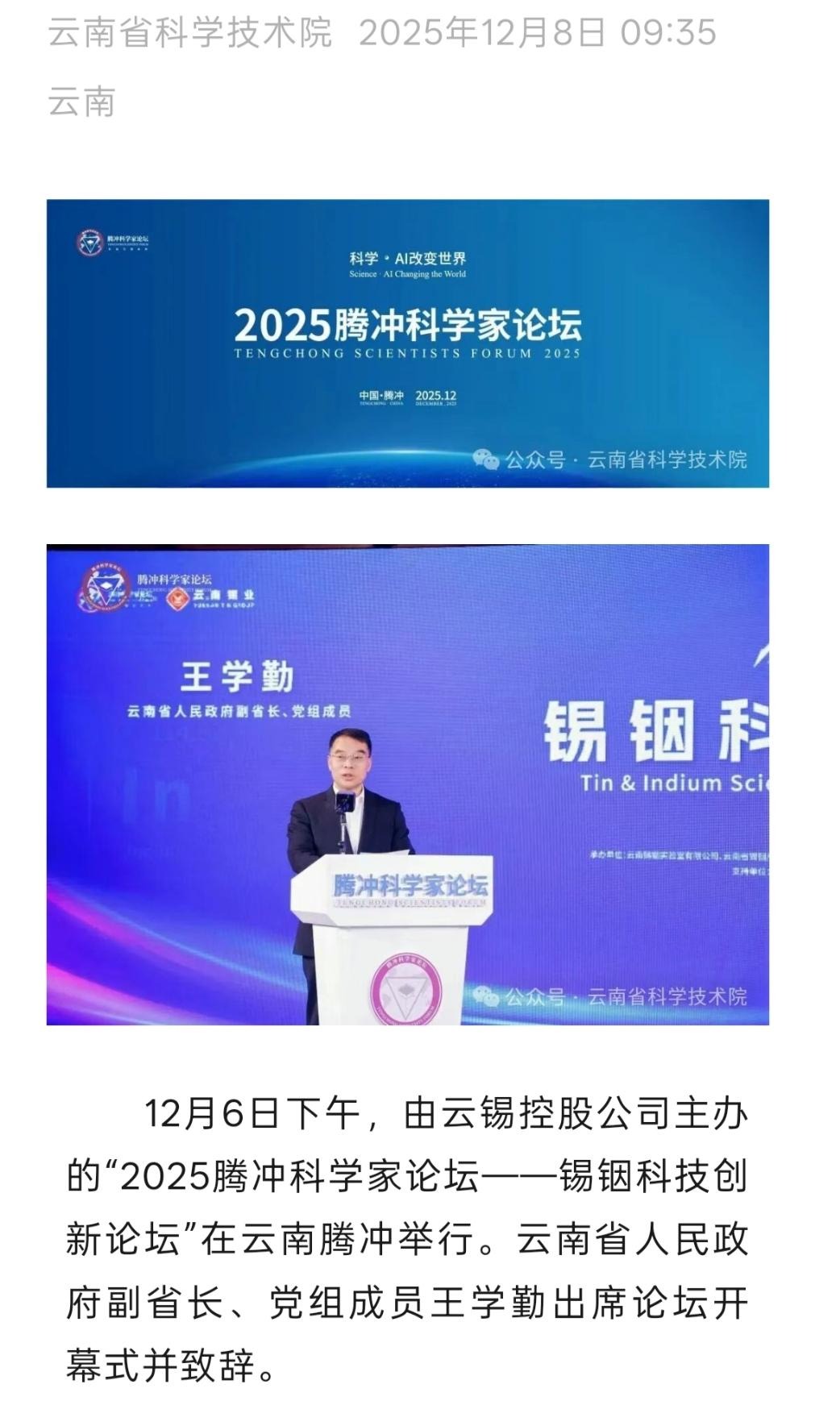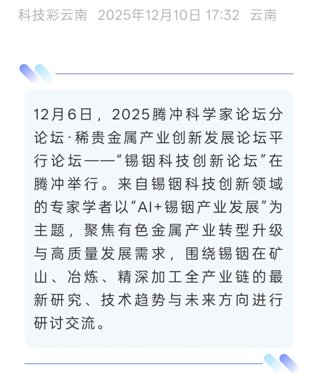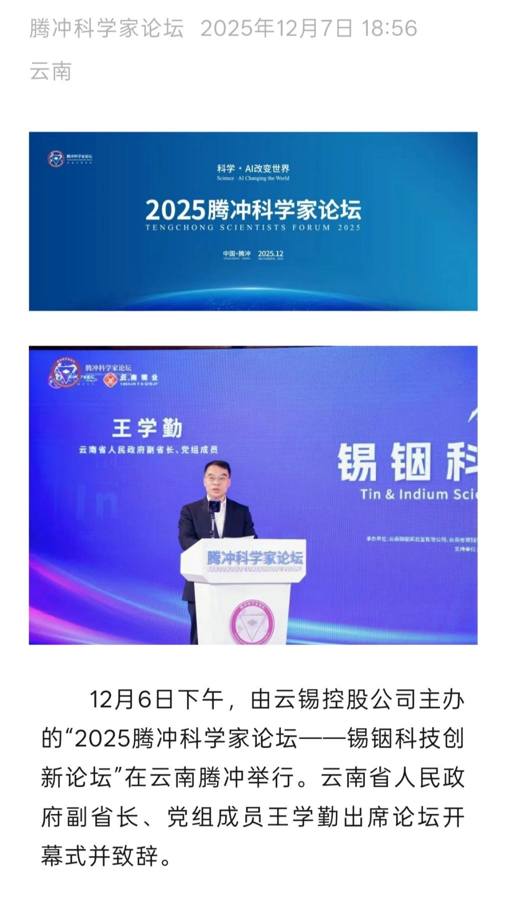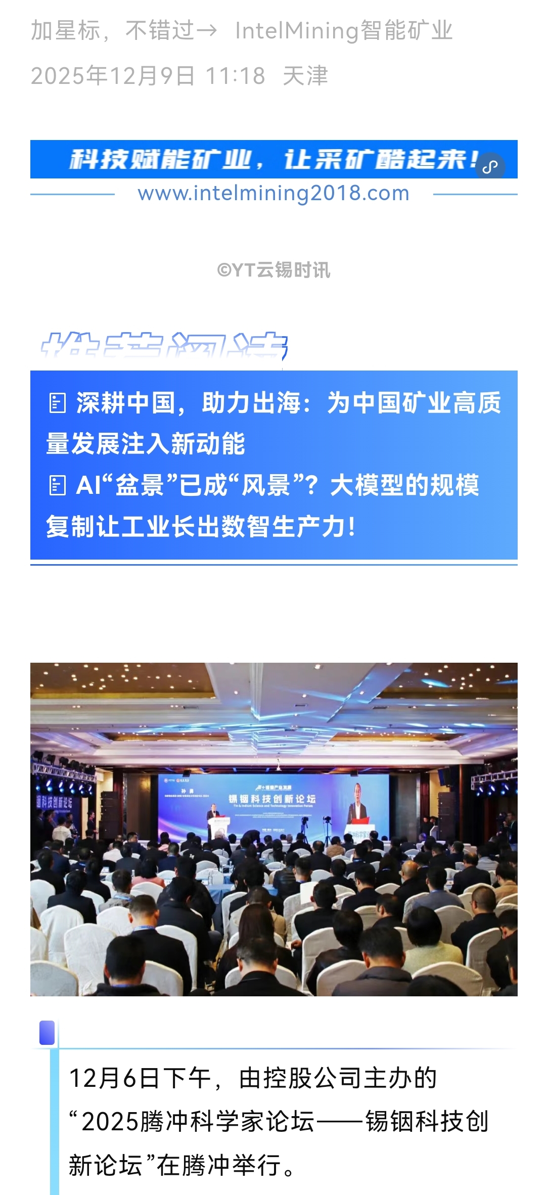来源:云南日报、云南省科学技术院、腾冲发布、腾冲科学家论坛、IntelMining智能矿业、科技彩云南、有色新闻