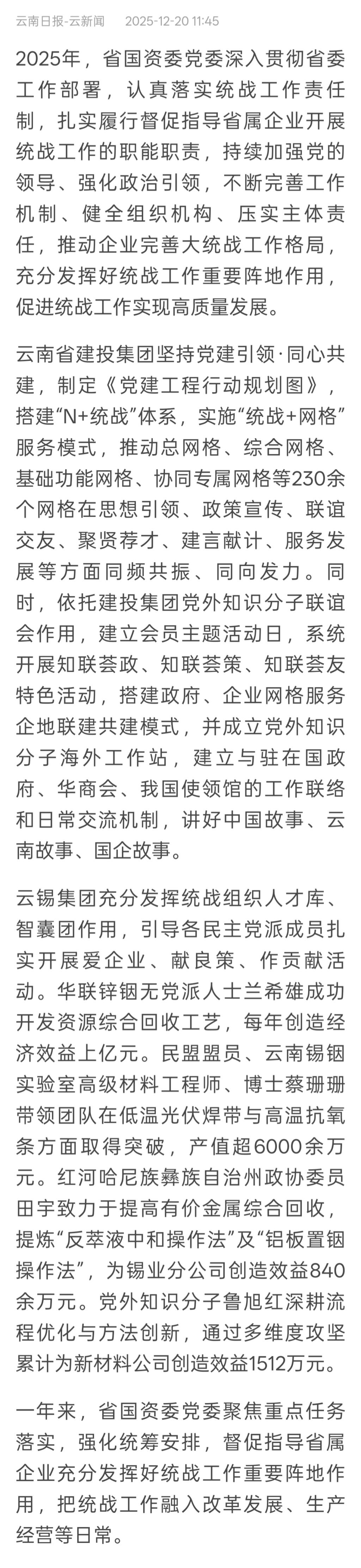 云锡集团充分发挥统战组织人才库、智囊团作用,引导各民主党派成员扎实开展爱企业、献良策、作贡献活动。华联锌铟无党派人士兰希雄成功开发资源综合回收工艺,每年创造经济效益上亿元。民盟盟员、云南锡铟实验室高级材料工程师、博士蔡珊珊带领团队在低温光伏焊带与高温抗氧条方面取得突破,产值超6000余万元。红河哈尼族彝族自治州政协委员田宇致力于提高有价金属综合回收,提炼“反萃液中和操作法”及“铝板置铟操作法”,为锡业分公司创造效益840余万元。党外知识分子鲁旭红深耕流程优化与方法创新,通过多维度攻坚累计为新材料公司创造效益1512万元。