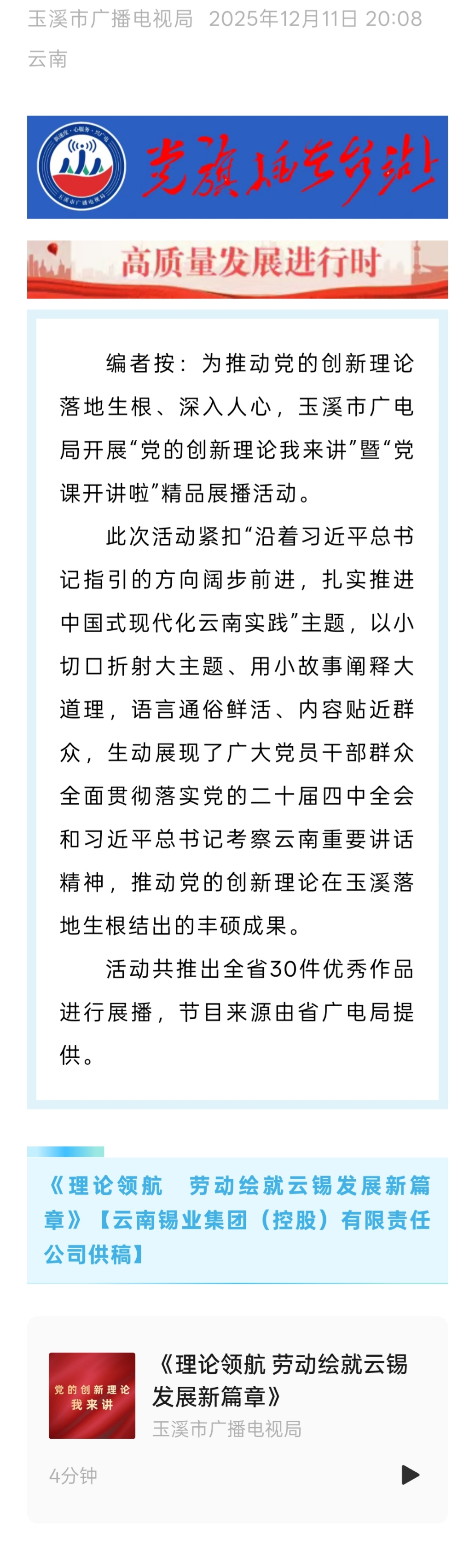 玉溪市广播电视局:《理论领航 劳动绘就云锡发展新篇章》——“党的创新理论我来讲”暨“党课开讲啦”精品展播活动作品展播