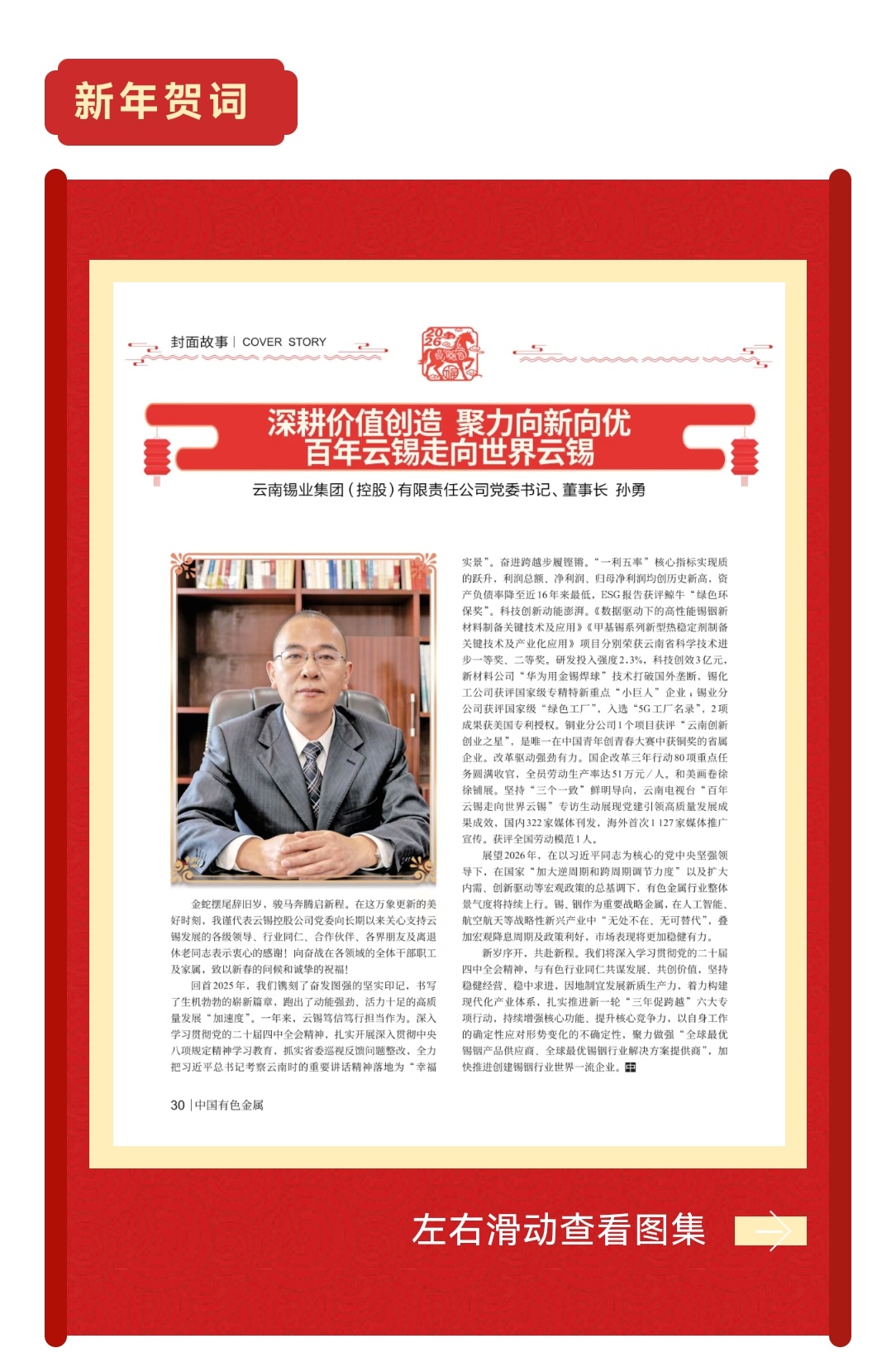 新岁序开,共赴新程。我们将深入学习贯彻党的二十届四中全会精神,与有色行业同仁共谋发展、共创价值,坚持稳健经营、稳中求进,因地制宜发展新质生产力,着力构建现代化产业体系,扎实推进新一轮“三年促跨越”六大专项行动,持续增强核心功能、提升核心竞争力,以自身工作的确定性应对形势变化的不确定性,聚力做强“全球最优锡铟产品供应商、全球最优锡铟行业解决方案提供商”,加快推进创建锡铟行业世界一流企业。