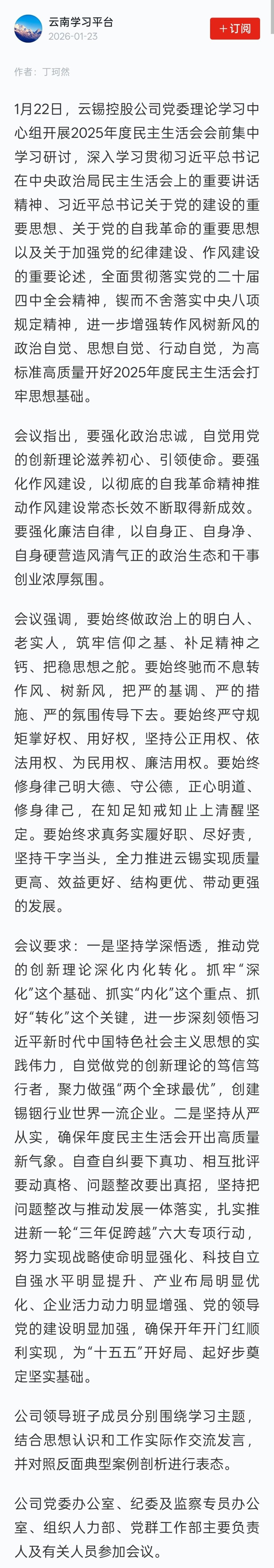 学习强国:云锡控股公司党委理论学习中心组开展2025年度民主生活会会前集中学习研讨