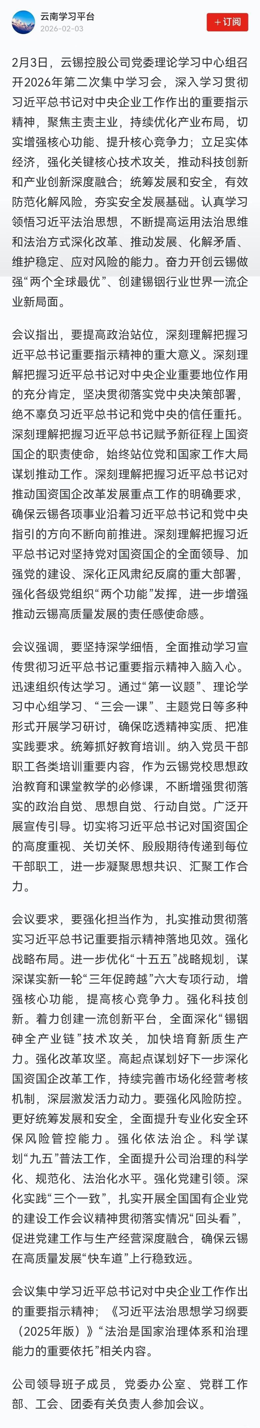 学习强国:云锡控股公司党委理论学习中心组举行2026年第二次集中学习