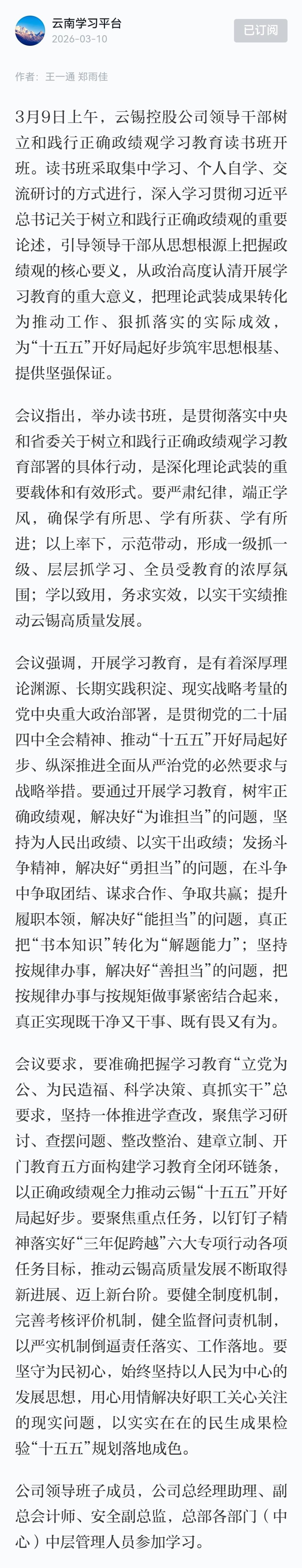 学习强国:云锡控股公司领导干部树立和践行正确政绩观学习教育读书班开班