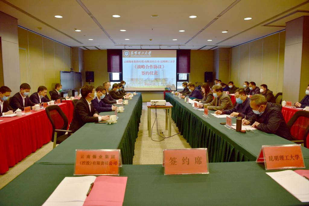 4月12日,云锡与昆明理工大学战略合作签署仪式在昆明理工大学莲华校区伍集成会堂三楼会议室举行。在控股公司党委书记、董事长胡均,昆明理工大学党委书记张英杰及双方参会人员的共同见证下,控股公司党委副书记、副董事长、总经理程睿涵与昆明理工大学党委副书记、校长王华代表校企双方签署了战略合作协议。