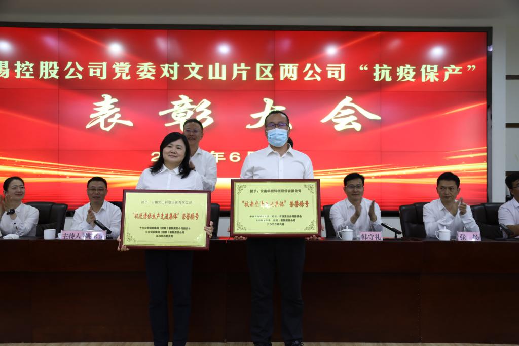 程睿涵宣读云锡控股公司党委表彰决定,授予华联锌铟“抗击疫情先进集体”荣誉称号,授予文山锌铟“抗疫情保生产先进集体”荣誉称号。
