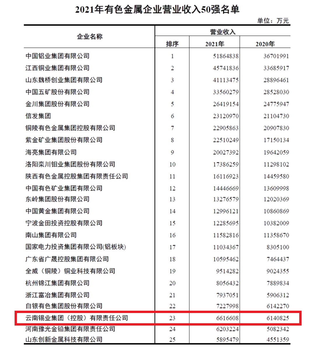 近日,中国有色金属工业协会召开新闻发布会,发布2021年有色金属企业营业收入50强名单,控股公司以营收661.66亿元的业绩,排名第23位。