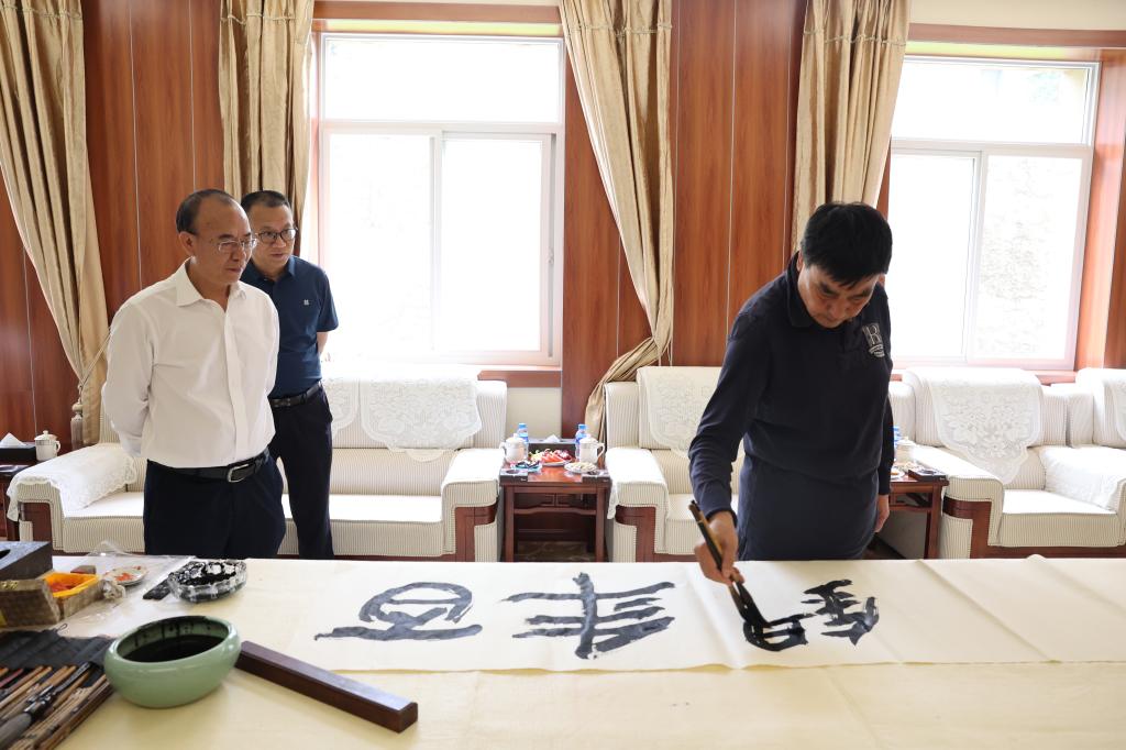 观展现场,杜建民挥毫泼墨,现场创作,一时墨香四溢,把一幅幅遒劲有力、气韵生动的书法作品送给了在场的干部职工。