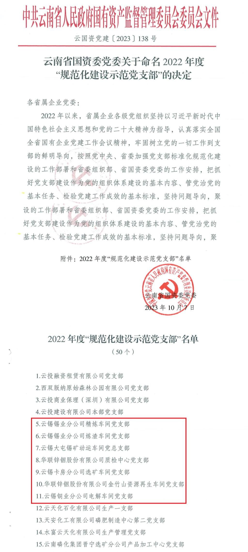 近日,省国资委党委下发关于命名2022年度“规范化建设示范党支部”的决定,命名50个党支部为“规范化建设示范党支部”,其中,云锡锡业分公司精炼车间等7个党支部获得命名。