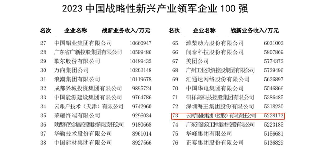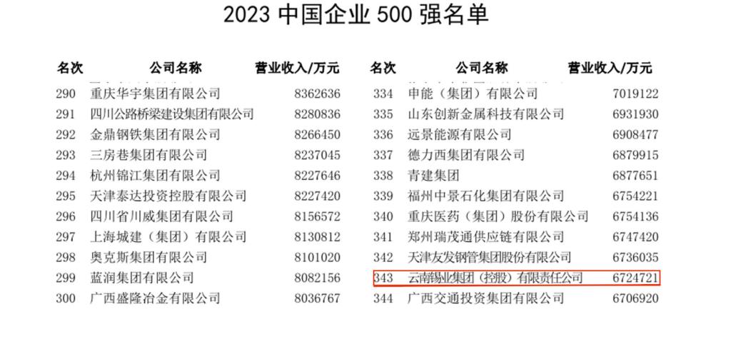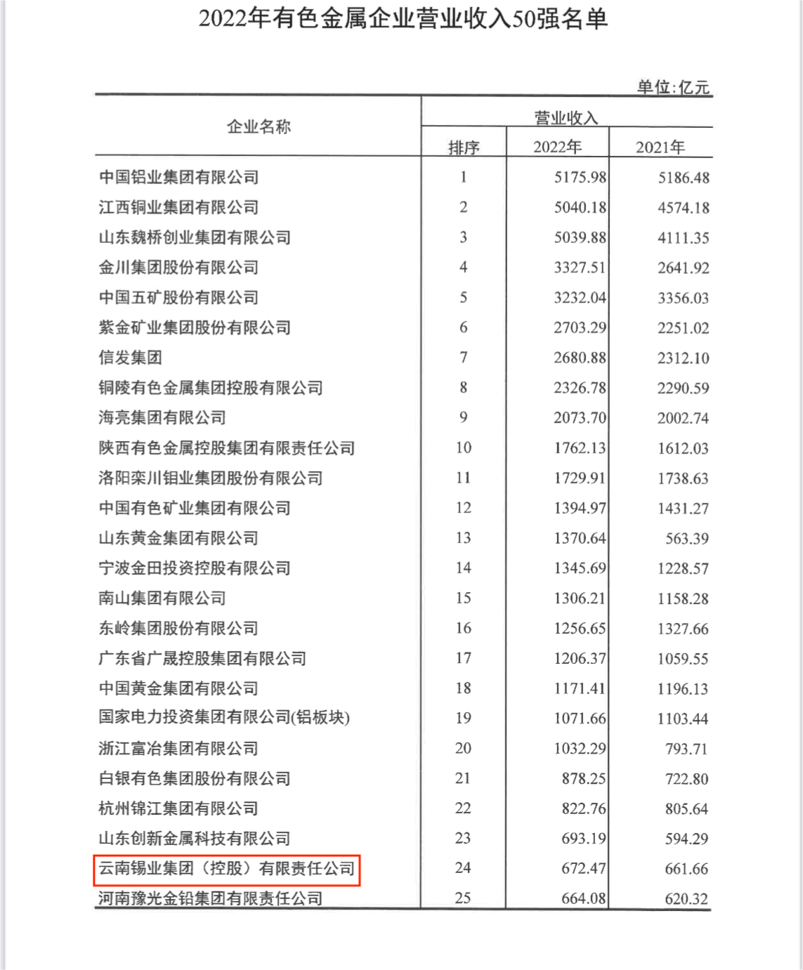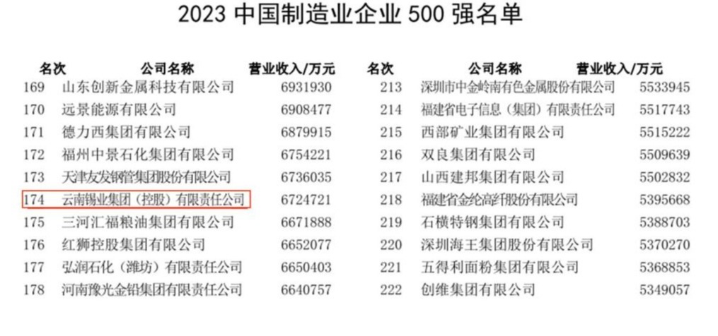 近日,中国企业联合会、中国企业家协会联合发布“2023中国企业500强”榜单。云锡位列2023年中国企业500强第343位,中国制造业企业500强第174位,中国战略性新兴产业领军企业100强73位。在中国有色金属工业协会发布的2022年有色金属企业50强榜单中,云锡位列第24位。