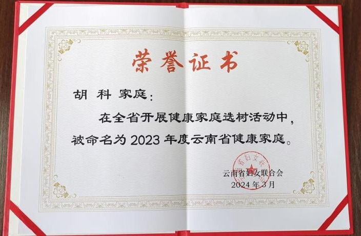 近日,老厂分公司塘子凹坑职工胡科在全省开展健康家庭选树活动中被命名为“2023年度云南省健康家庭”。