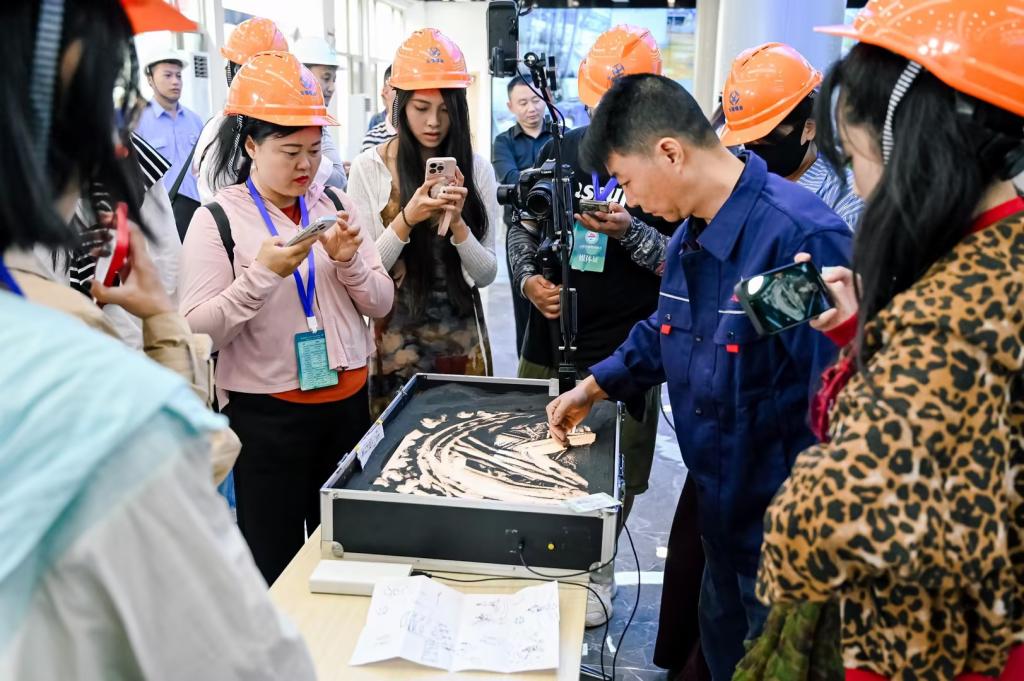 期间,锡业分公司在智慧运营中心打卡点开展沙画创作展示。云锡文联沙画作家在尺寸之间,如同放映机般,把锡冶炼厂貌、锡锭产品、直线浇铸工业机械臂等代表性镜头挥沙成画、栩栩如生,吸引众多来宾打卡拍摄。