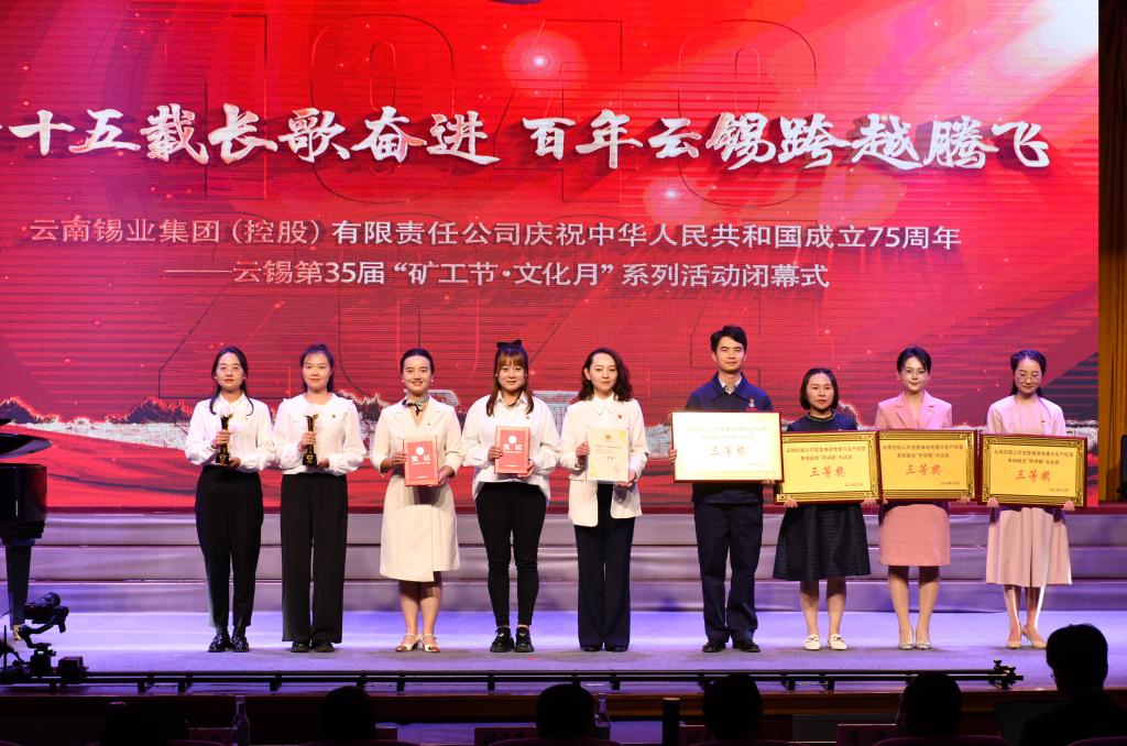 控股总经理助理卢丽桃、副总会计师刘昆为职工气排球比赛第一名、“强国复兴有我·致敬先进”微视频大赛一等奖、“书香彩云南”云南省职工阅读展示活动第一名、“学讲做”大比武决赛三等奖获奖代表颁奖,图为获奖代表合影。
