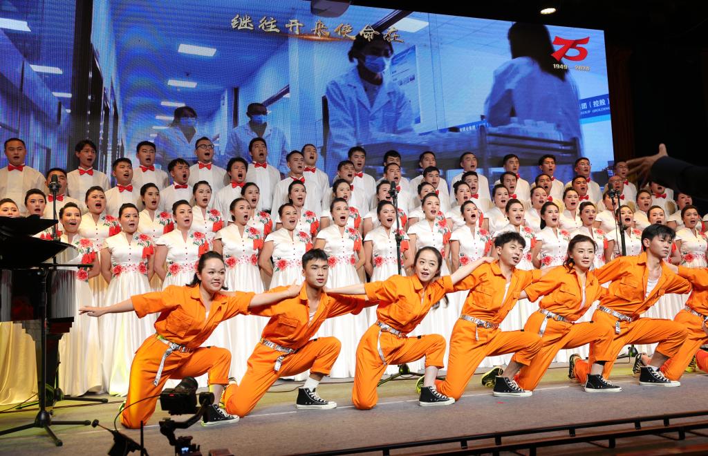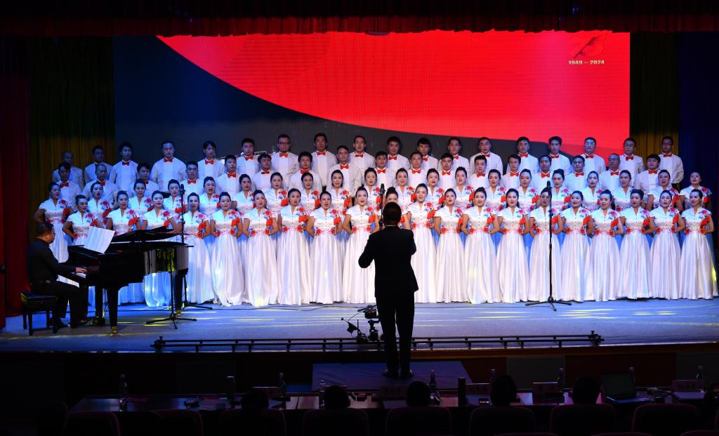 控股公司领导及嘉宾带领会场全体人员合唱《歌唱祖国》,用歌声为控股公司庆祝中华人民共和国成立75周年活动画上圆满句号。