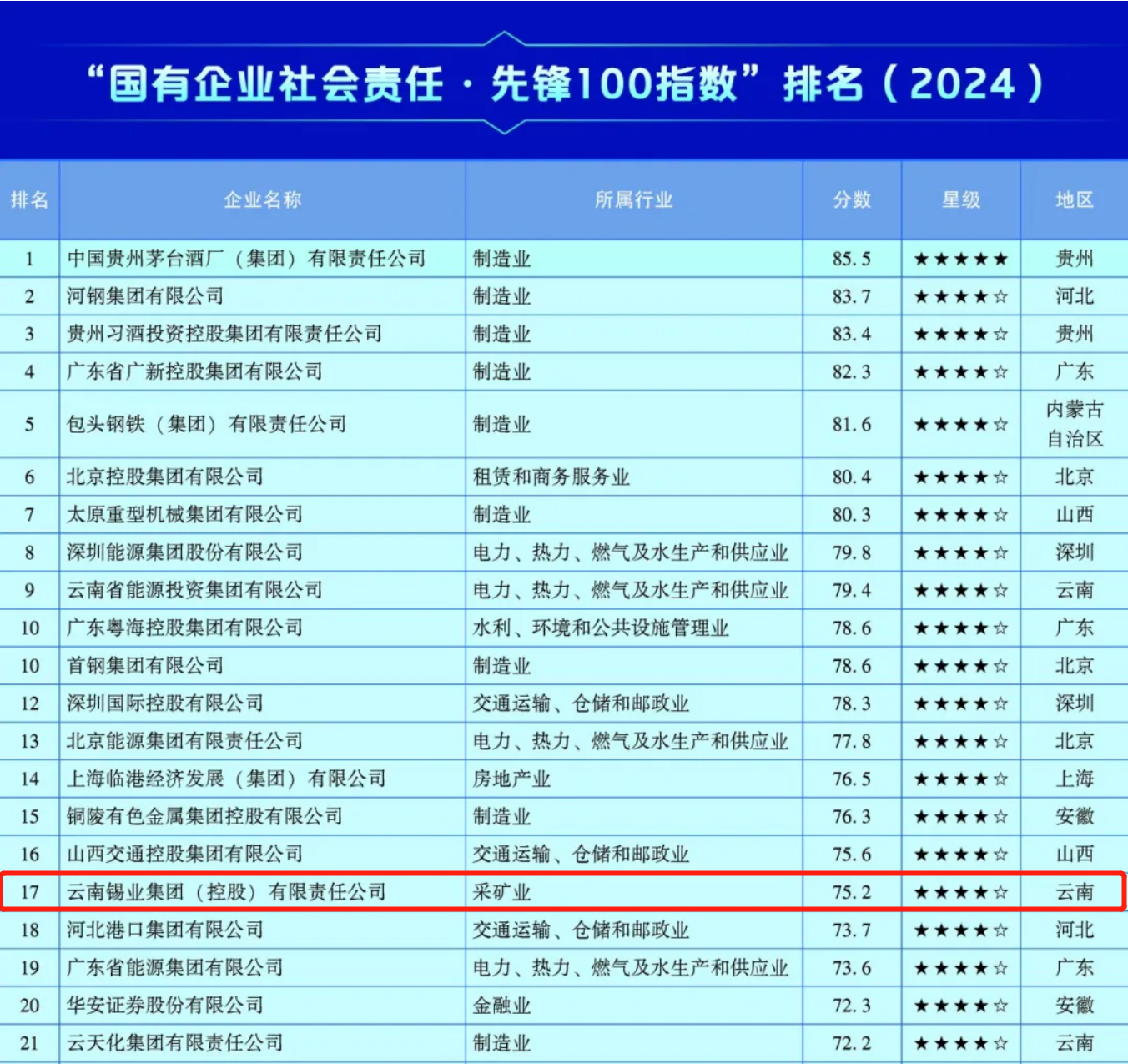 近日,国务院国资委在北京举行“第七届中国企业论坛国有企业社会责任平行分论坛”,发布《国资国企社会责任蓝皮书》和“国有企业社会责任·先锋100指数”、“国有企业上市公司ESG·先锋100指数”。云锡连续第二年荣登“国有企业社会责任·先锋100指数”榜单,位列第17名,较2023年第21名上升4个位次。