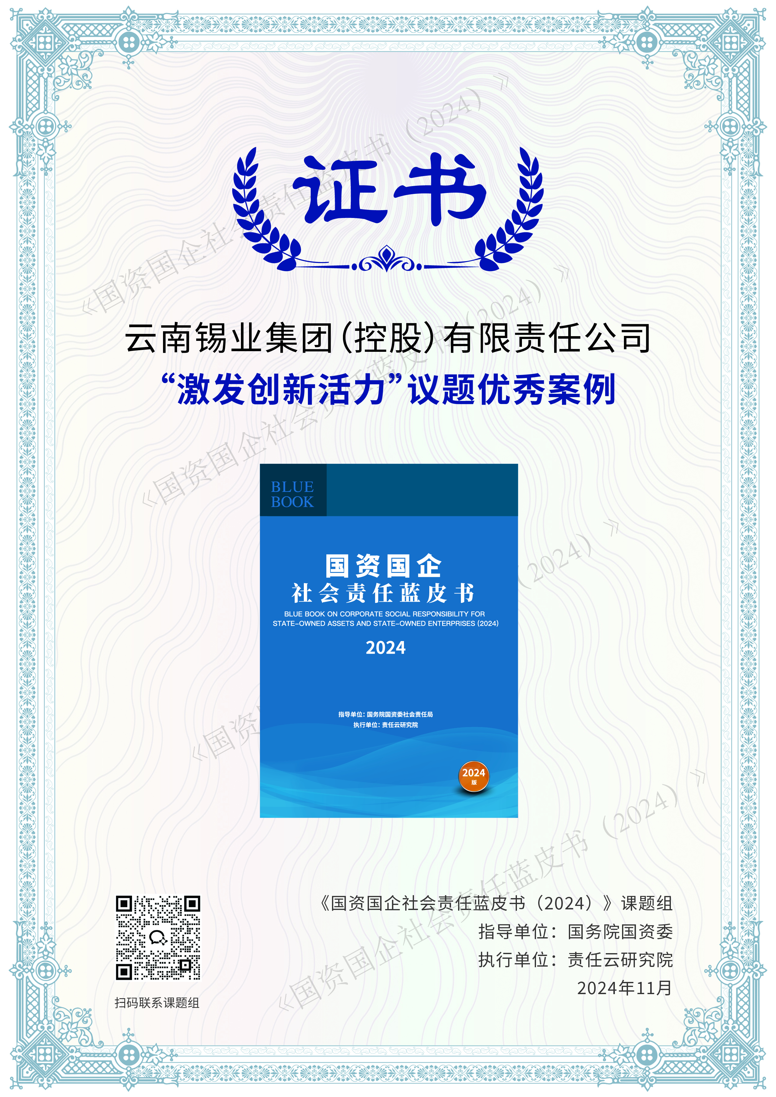 《国资国企社会责任蓝皮书(2024)》由国务院国资委社会责任局指导、责任云研究院执行,全面梳理国资国企社会责任发展趋势和阶段性特征,推动国资国企更加科学、系统、持续、高效地履行社会责任,提升国资国企社会责任工作影响力。云锡《打造国家知识产权示范企业 提升锡铟产业核心竞争优势》入选《国资国企社会责任蓝皮书(2024)》激发创新活力类议题优秀案例。