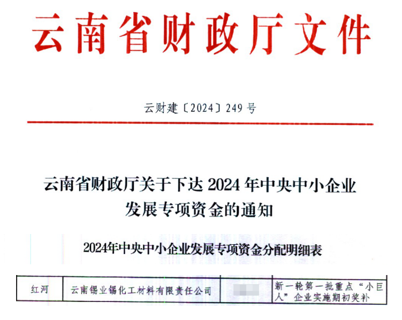 2024年,工业和信息化部联合财政部开展新一轮第一批支持专精特新中小企业高质量发展工作,择优遴选出一批重点“小巨人”企业予以支持。云南省9家企业入选,锡化工公司位列其中,成为云锡首家国家级专精特新重点“小巨人”企业。