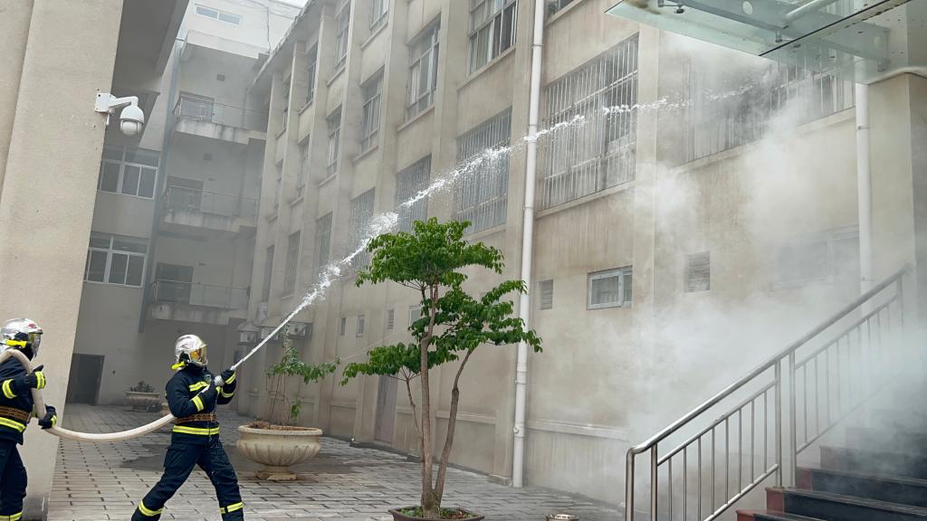 随着演练模拟的火灾烟雾开始蔓延,演练人员方案的要求按灭火行动组、通讯联络组、疏散引导组、安全救护组、安全警戒组、宣传运输保障组分工协作,保证了科技楼疏散人员用毛巾掩住口鼻,沿预定路线有序撤离,火灾得以及时扑灭。