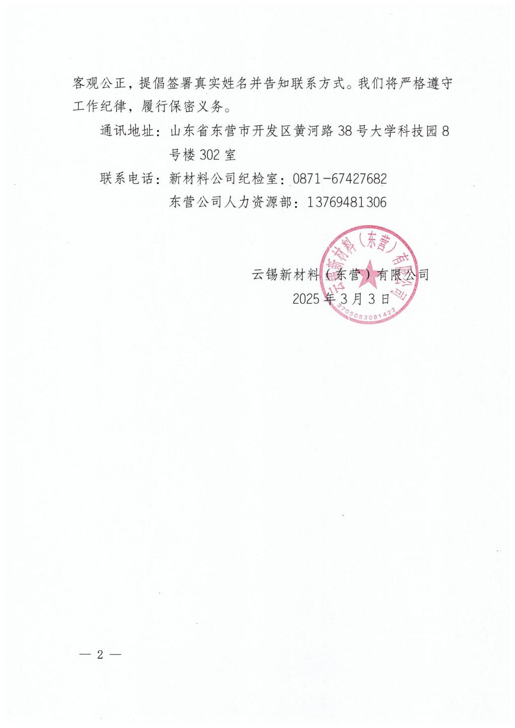 云锡新材料(东营)有限公司2025年度社会招聘拟录用人员公示
