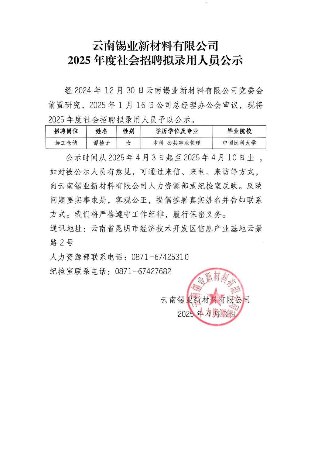 云南锡业新材料有限公司2025年度社会招聘拟录用人员公示