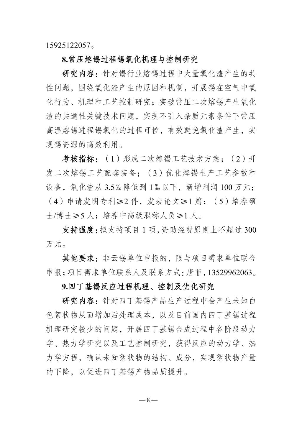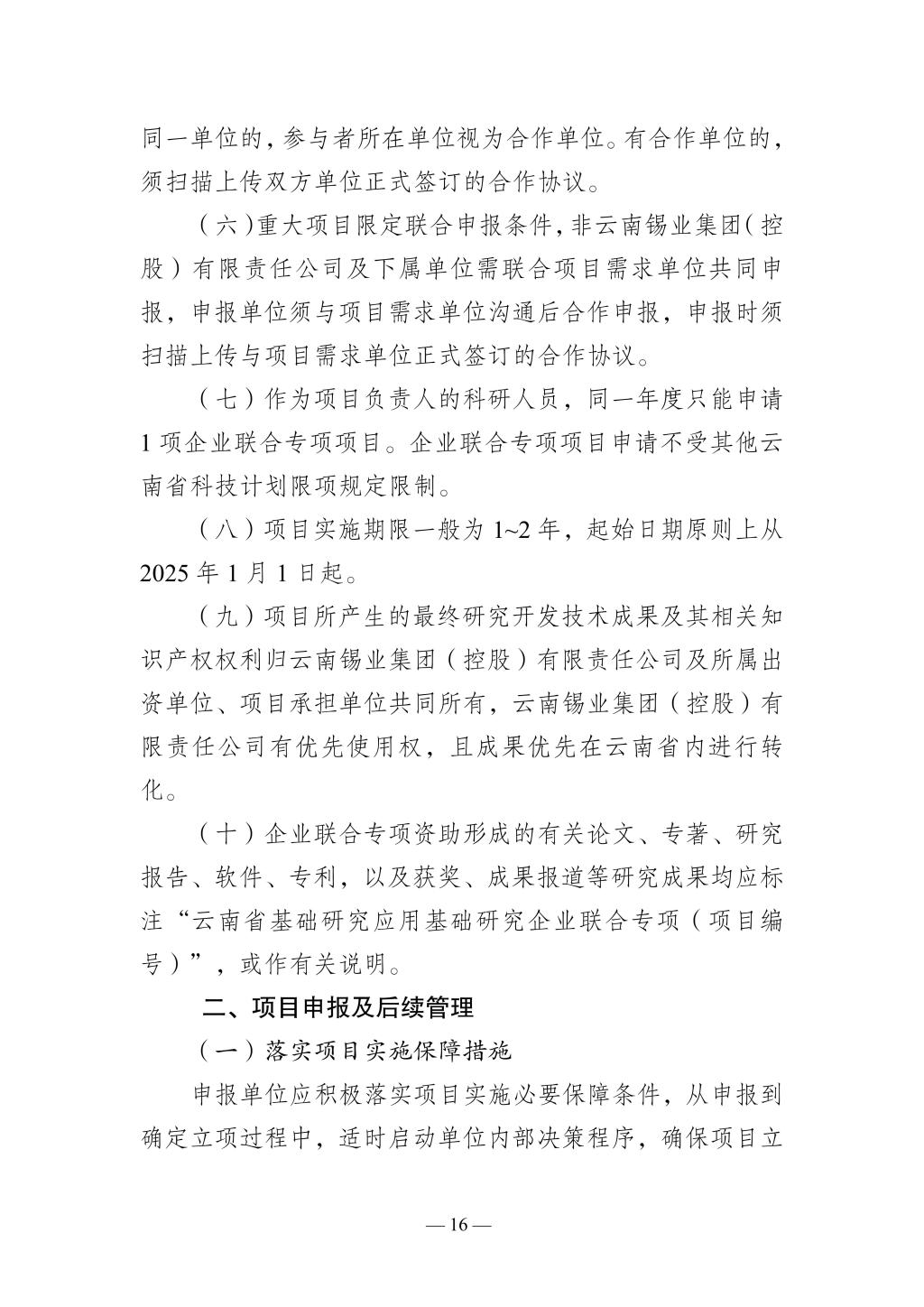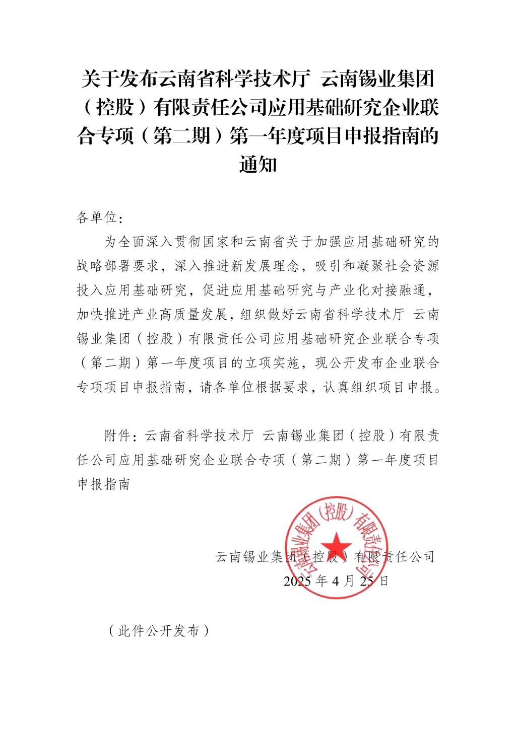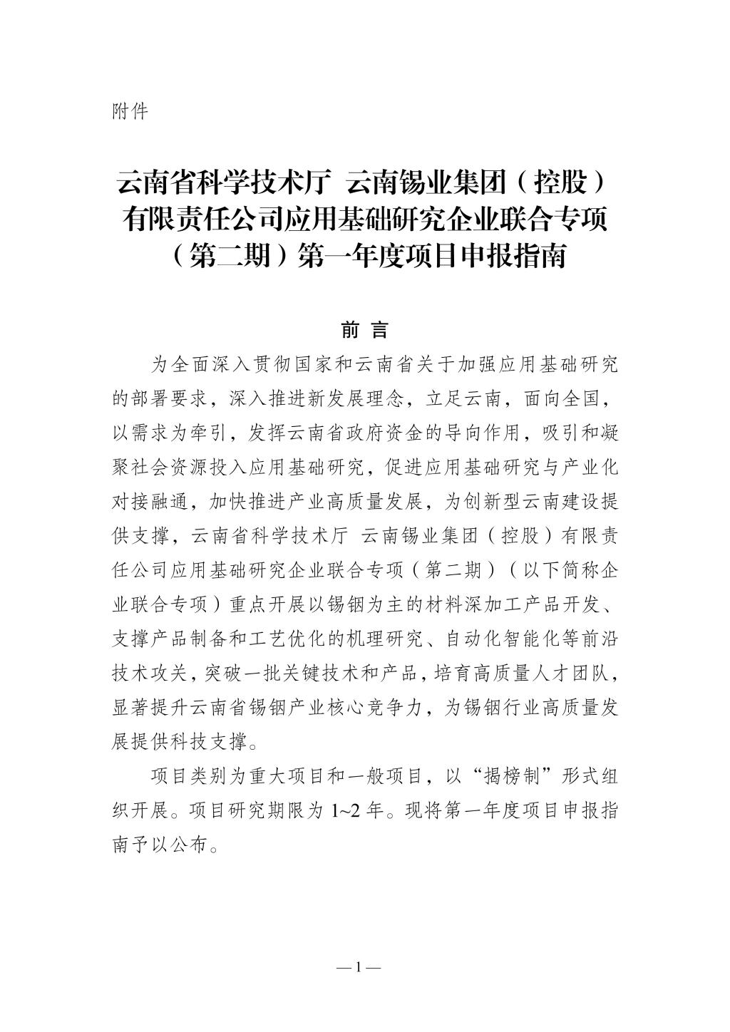 关于发布云南省科学技术厅 云南锡业集团(控股)有限责任公司应用基础研究企业联合专项(第二期)第一年度项目申报指南的通知