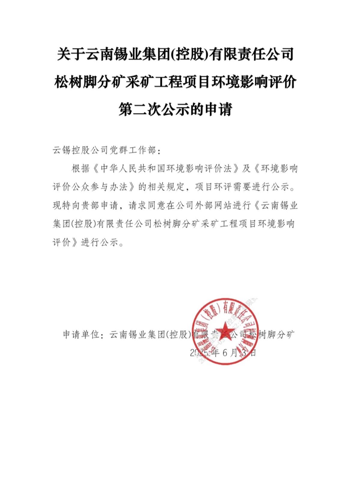 关于云南锡业集团(控股)有限责任公司松树脚分矿采矿工程项目环境影响评价第二次公示的申请