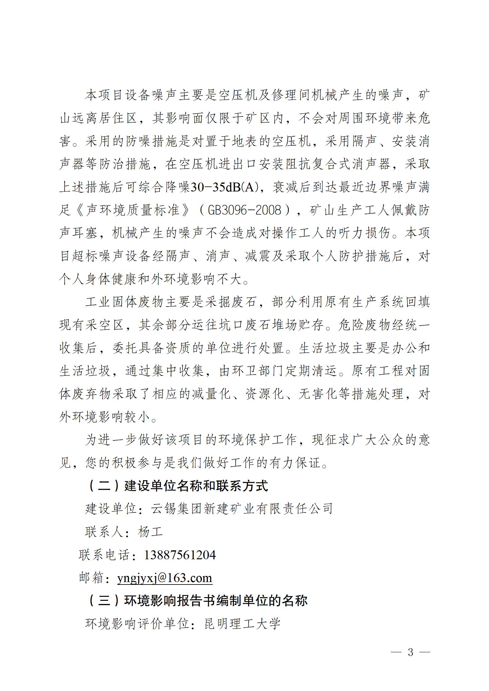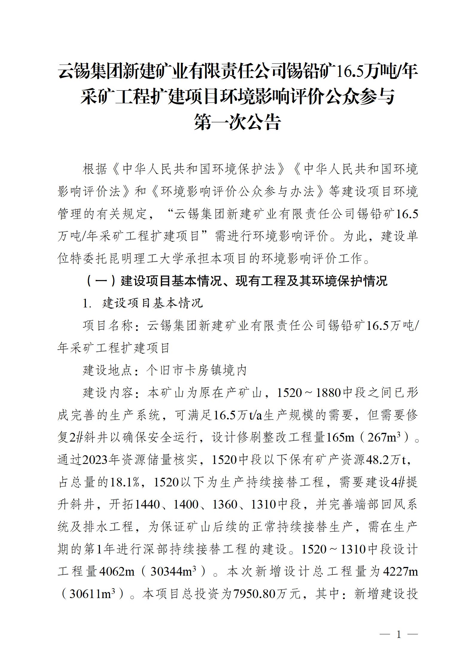 云锡集团新建矿业有限责任公司锡铅矿16.5万吨年采矿工程扩建项目环境影响评价公众参与第一次公告.docx