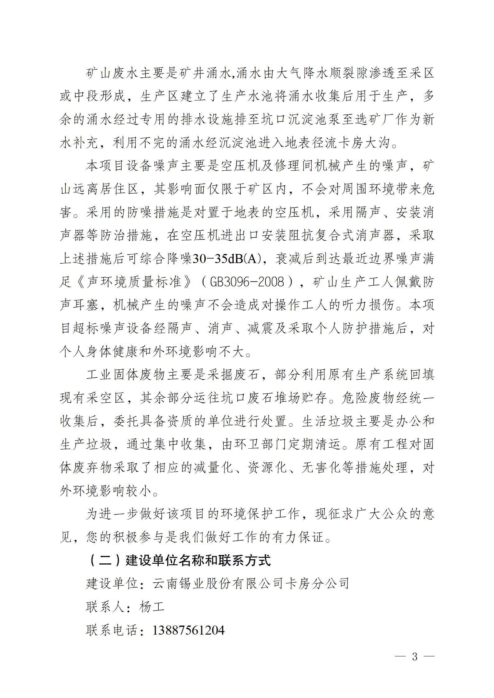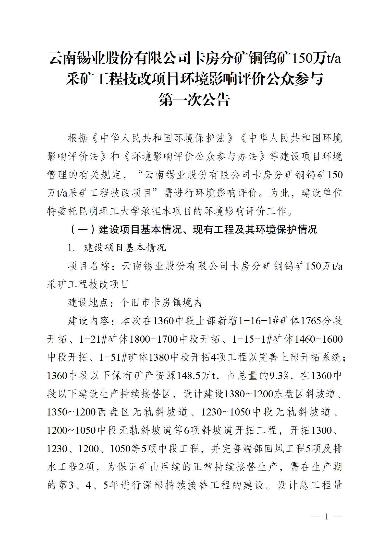 云南锡业股份有限公司卡房分矿铜钨矿150万ta采矿工程技改项目环境影响评价公众参与第一次公告.docx