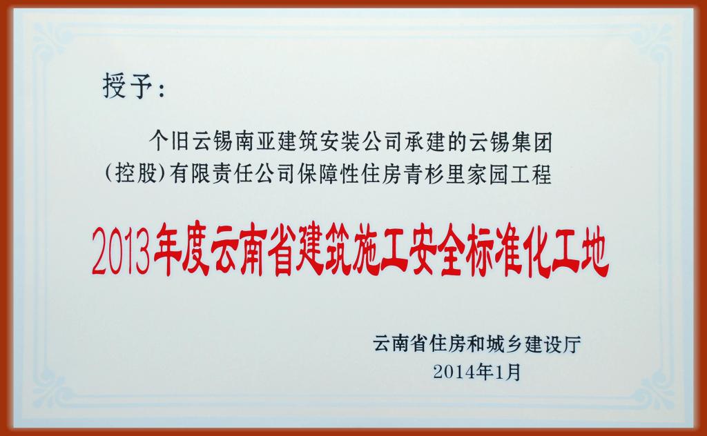青杉里家园工程被评为2013年度云南省建筑施工安全标准化工地
