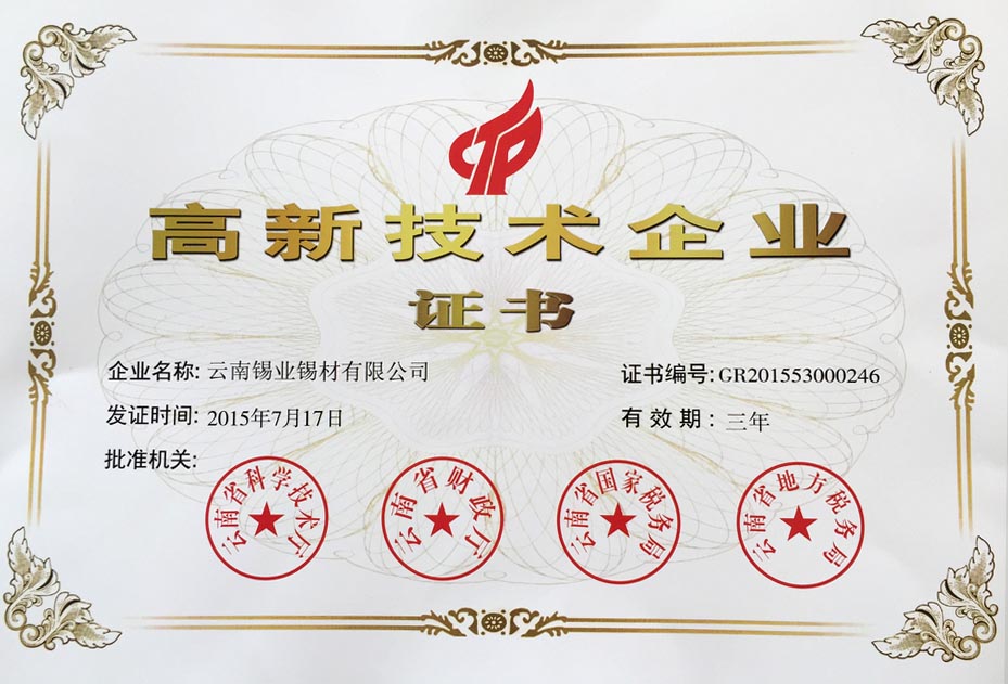 锡材公司被认定为云南省2015年第一批高新技术企业
