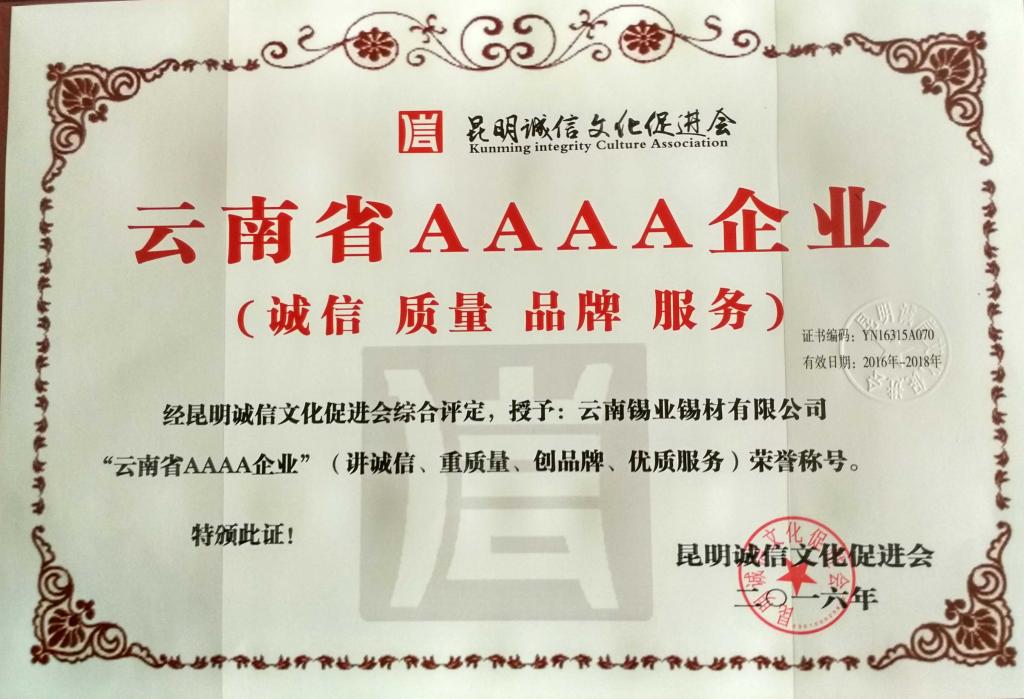 锡材公司喜获“云南省AAAA企业”荣誉称号
