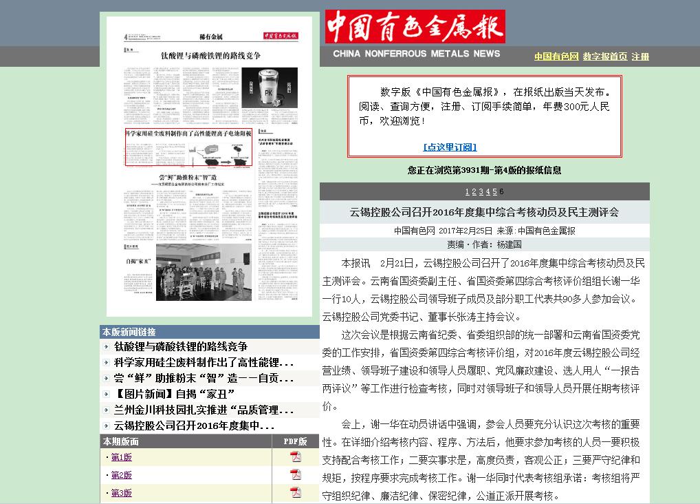 中国有色金属报 :云锡控股公司召开2016年度集中综合考核动员及民主测评会