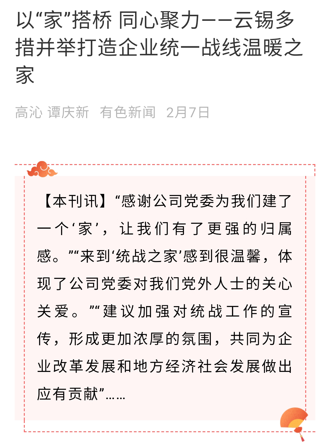 有色新闻:以“家”搭桥 同心聚力——云锡多措并举打造企业统一战线温暖之家