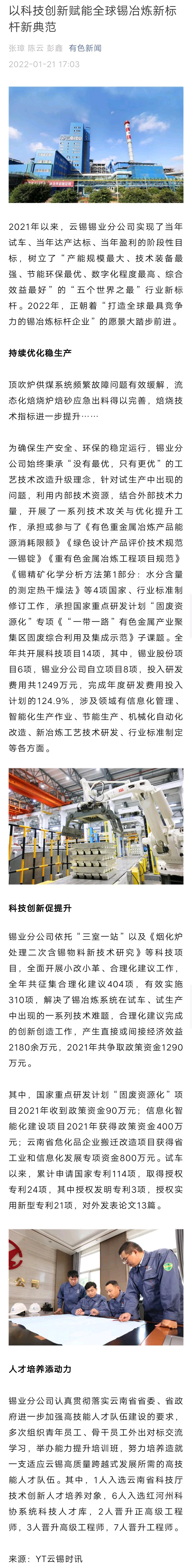 云南国资、有色新闻:以科技创新赋能全球锡冶炼新标杆新典范