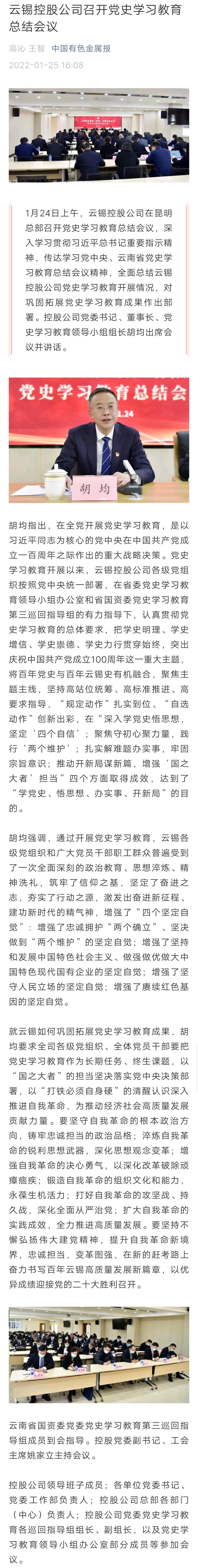 中国有色金属报:云锡控股公司召开党史学习教育总结会议